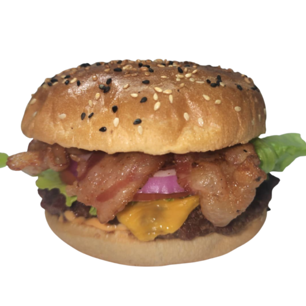 Carne jugosa, queso americano, aderezo Don Rico, lechuga, cebolla morada, tomate y delicioso tocino
