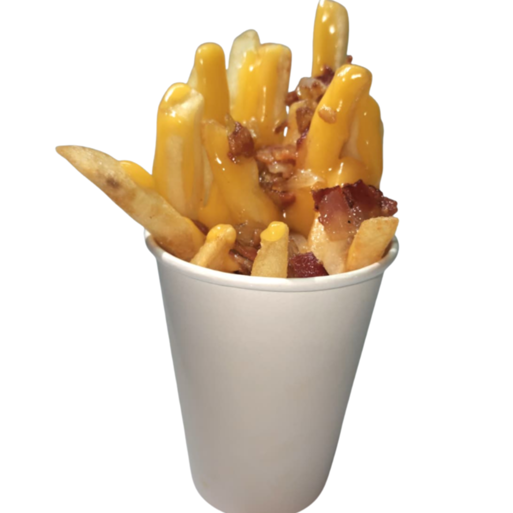 crujientes papas a la francesa con queso, tocino y aderezos.