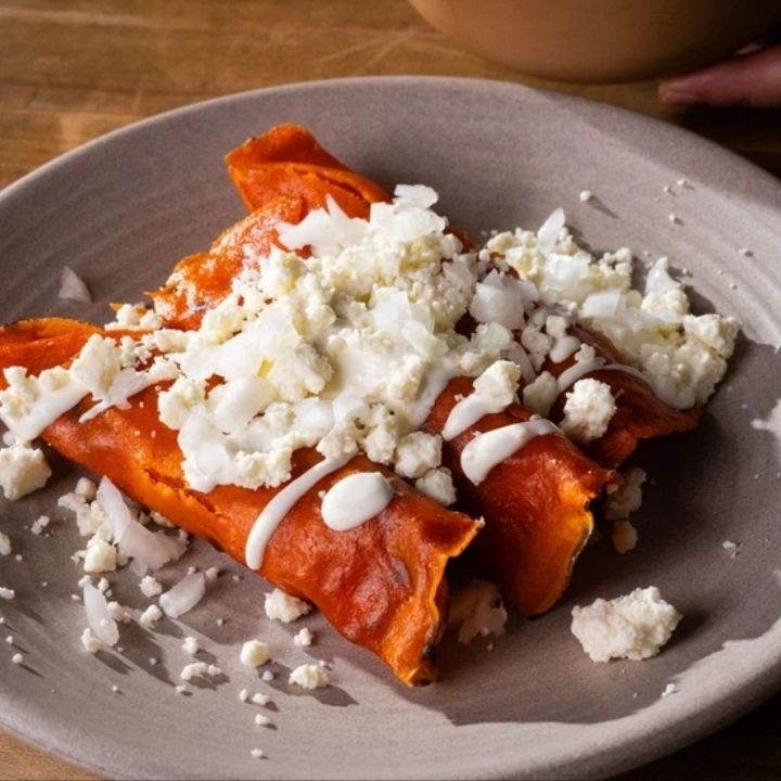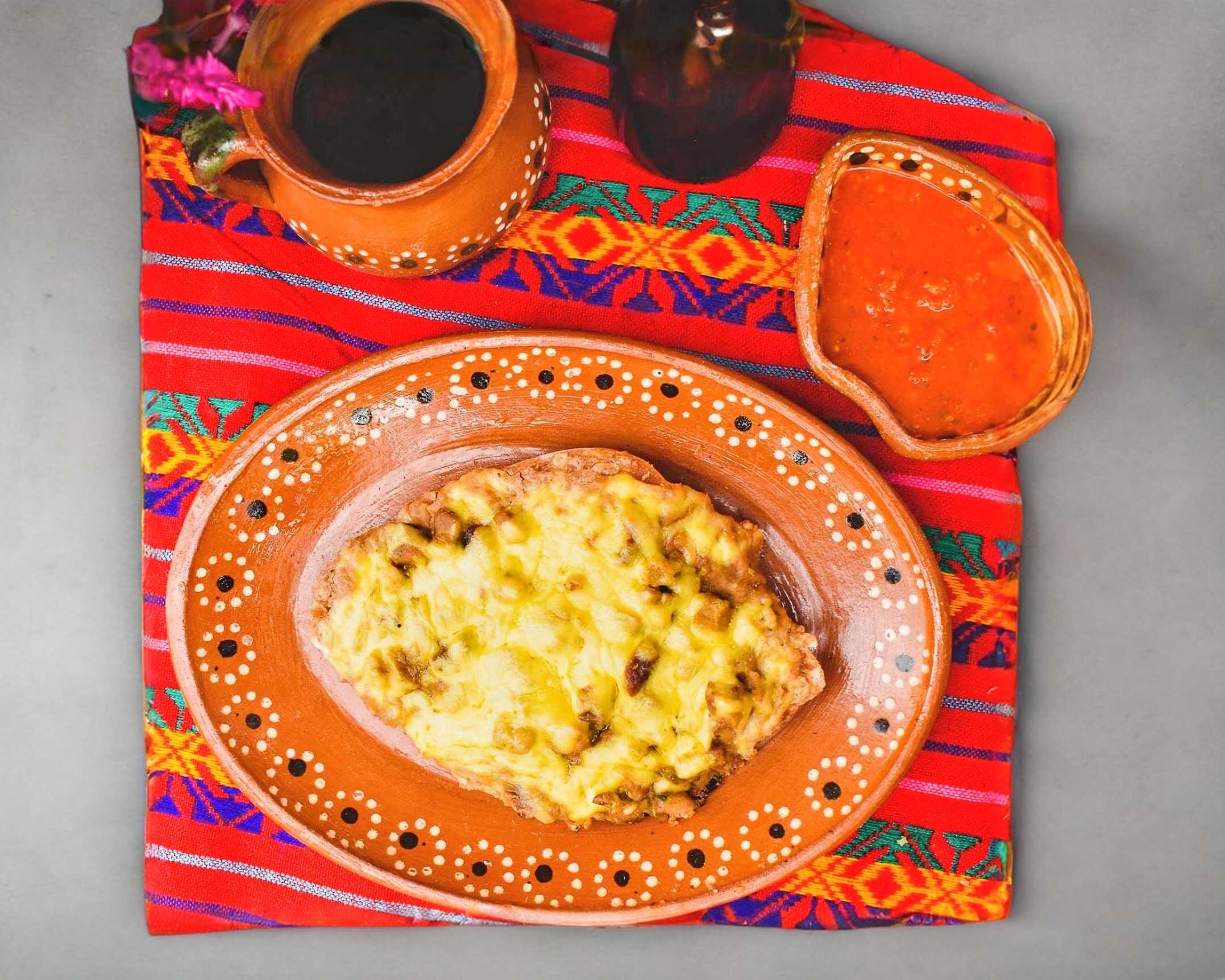 Totopo de maíz, bañado en salsa de tu preferencia con crema, cebolla morada y cilantro, acompañado con frijoles refritos.