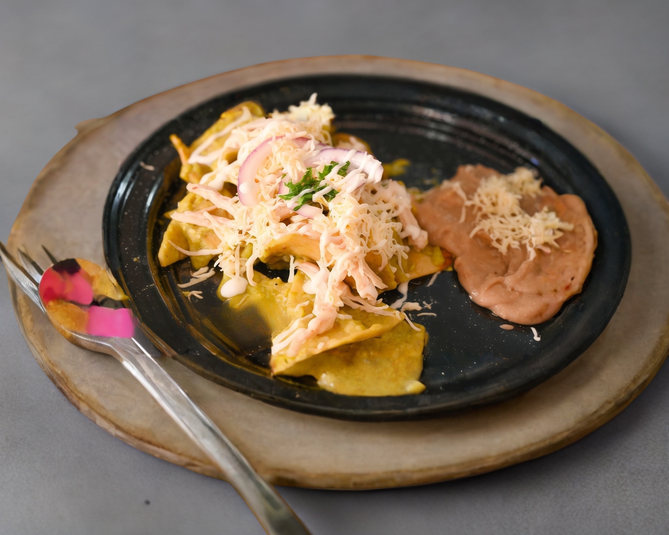 Totopos de maíz, bañado en salsa de tu preferencia con crema, cebolla, frijoles refritos y uno de nuestros guisos.
