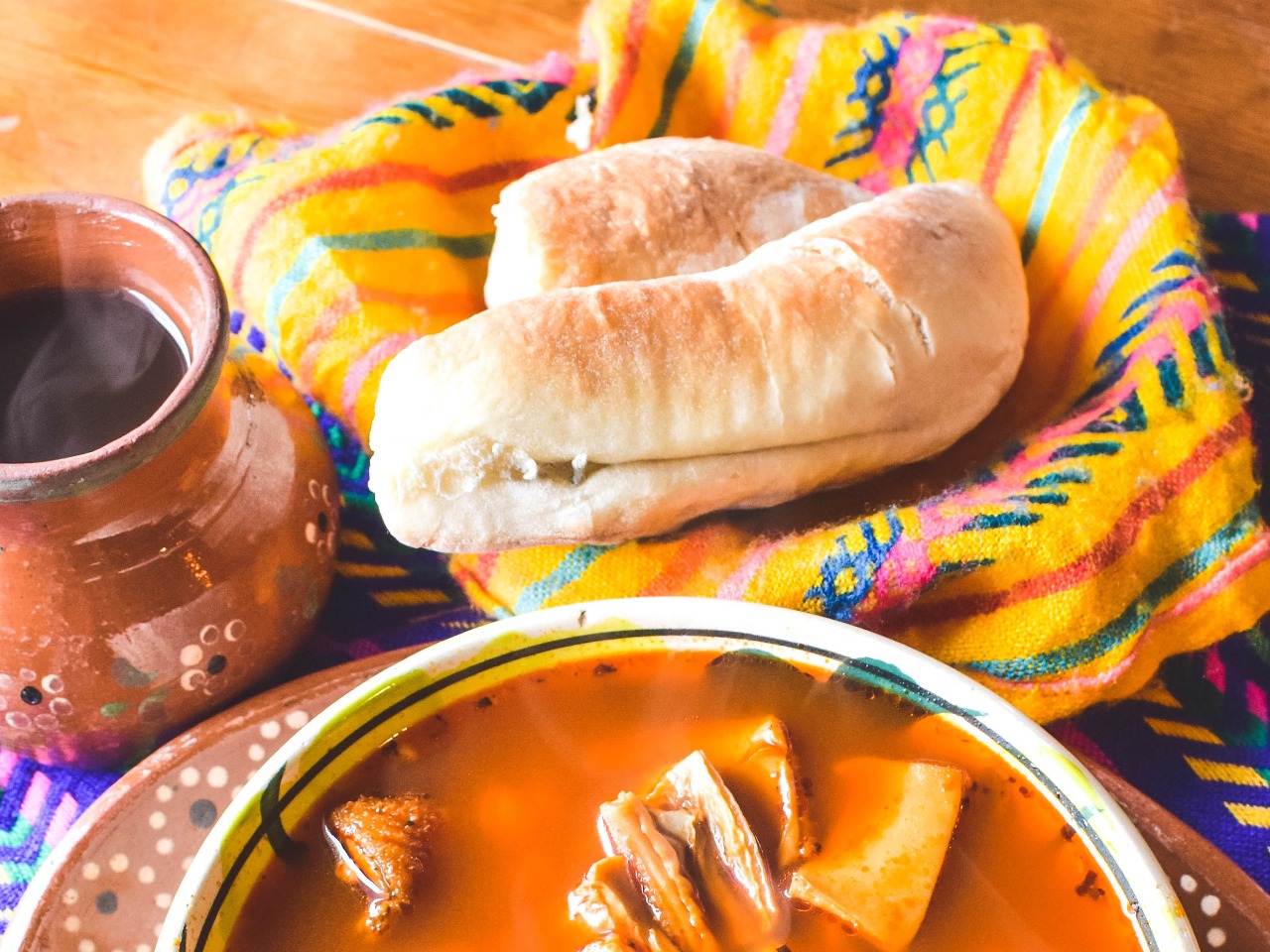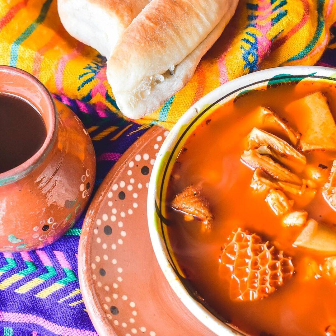 Menudo domingos el secreto de Doña Chepa servido en un plato hondo, acompañado de orégano, cebolla, chile quebrado y limón.