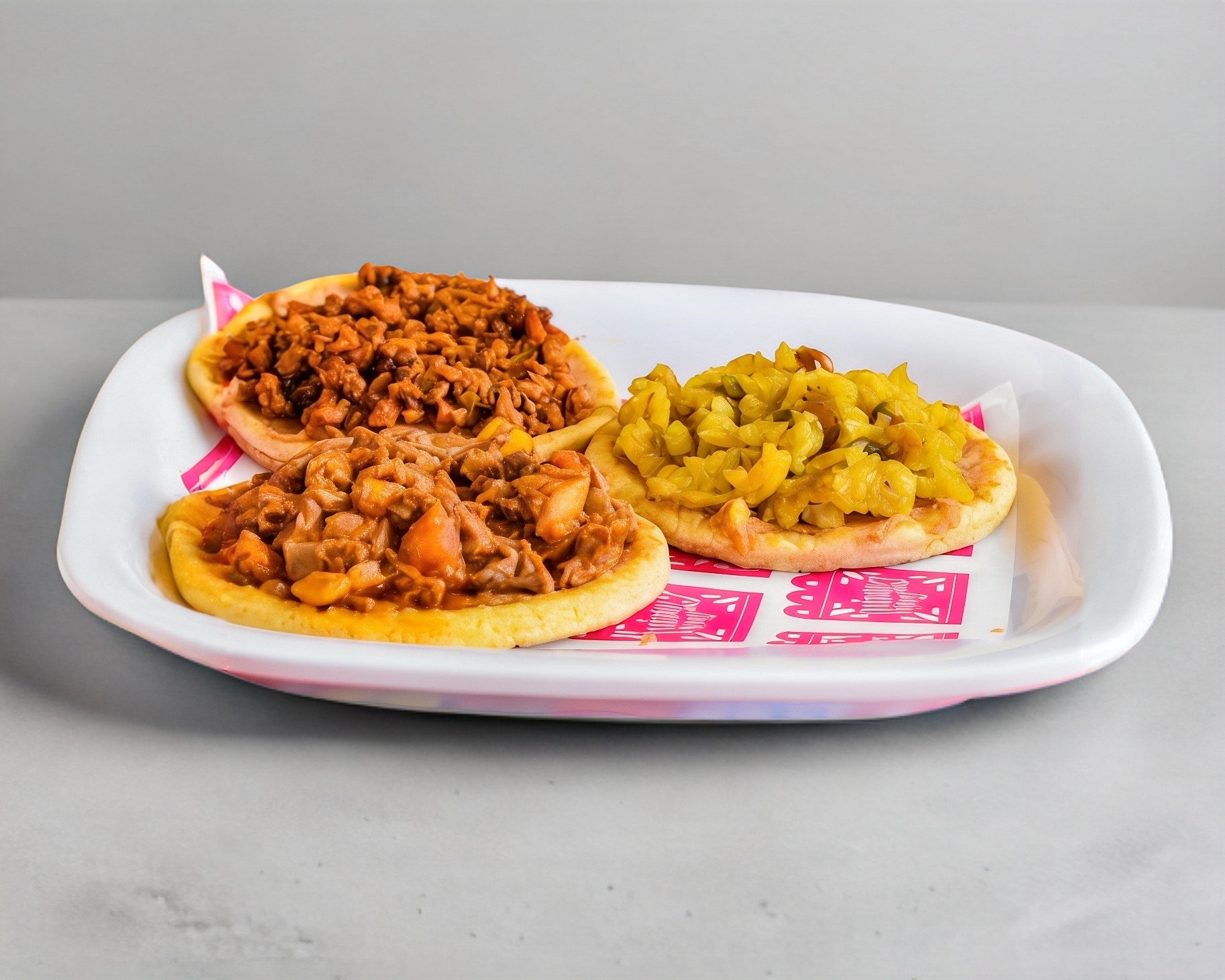 Orden de 3 piezas. Sope de maíz con una base de frijoles relleno con tu guiso favorito, acompañado de ensalada fresca y cueritos curtidos.