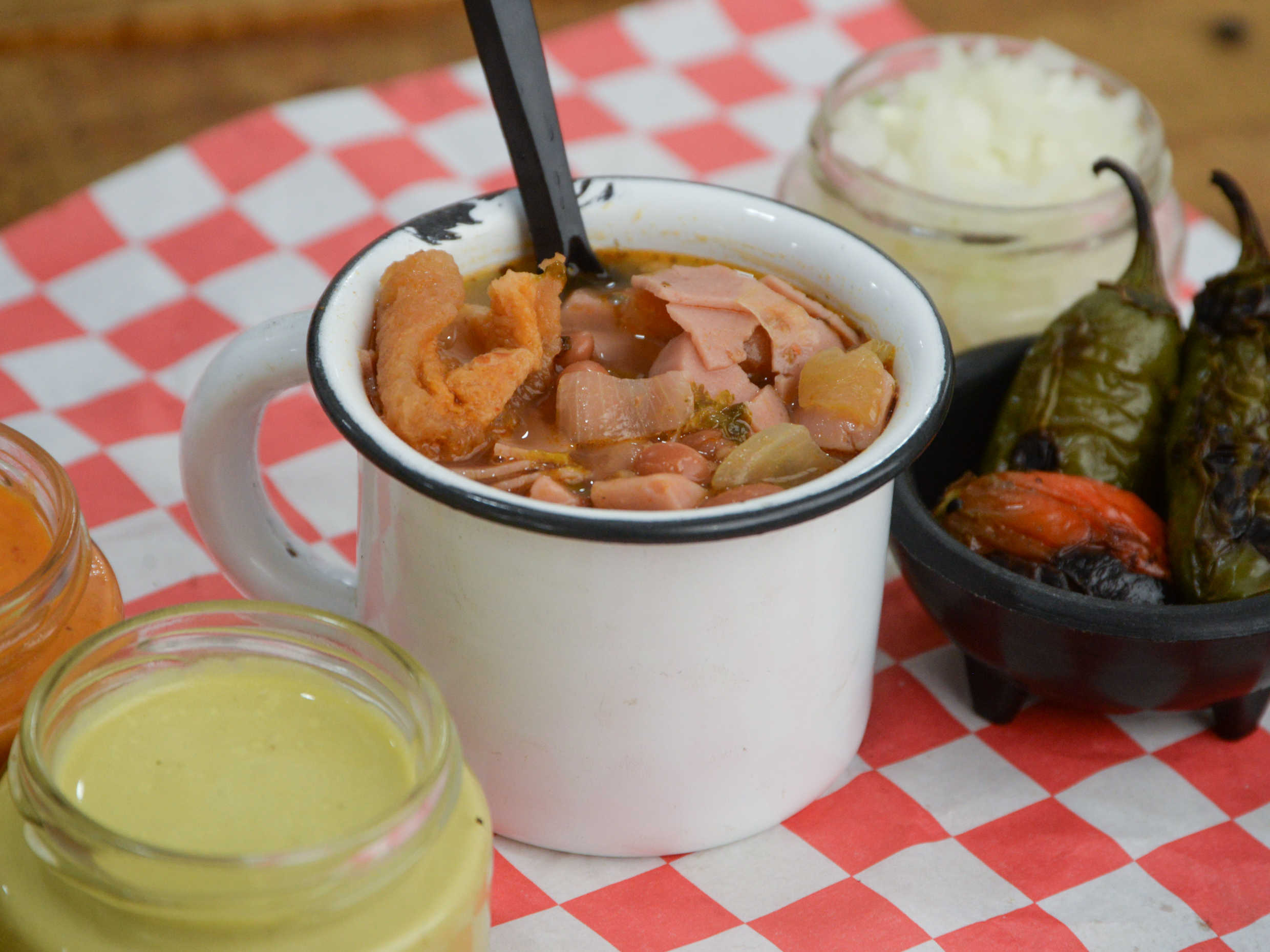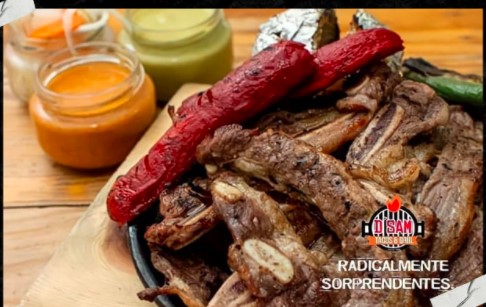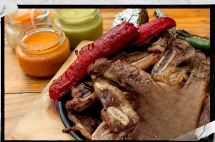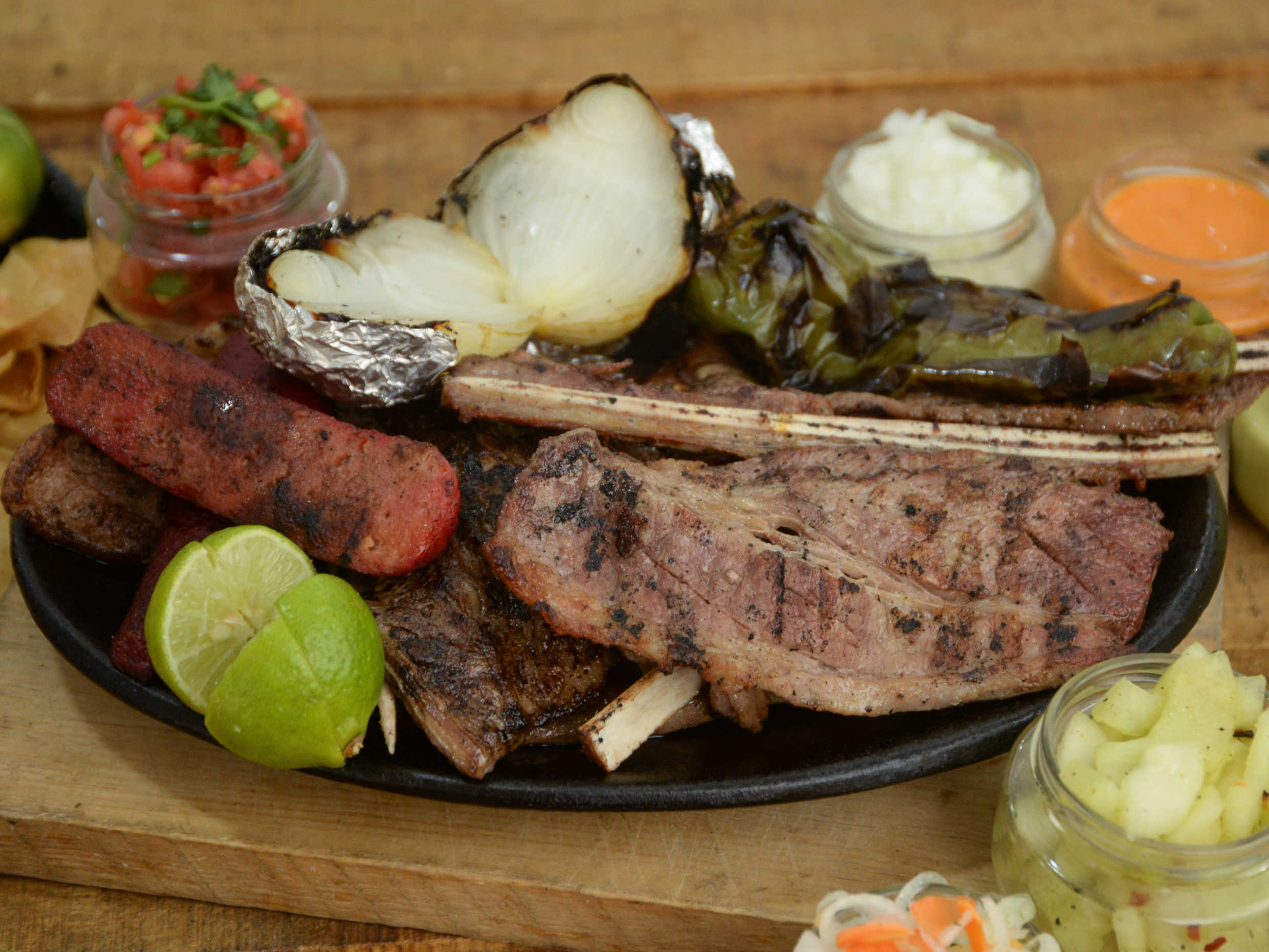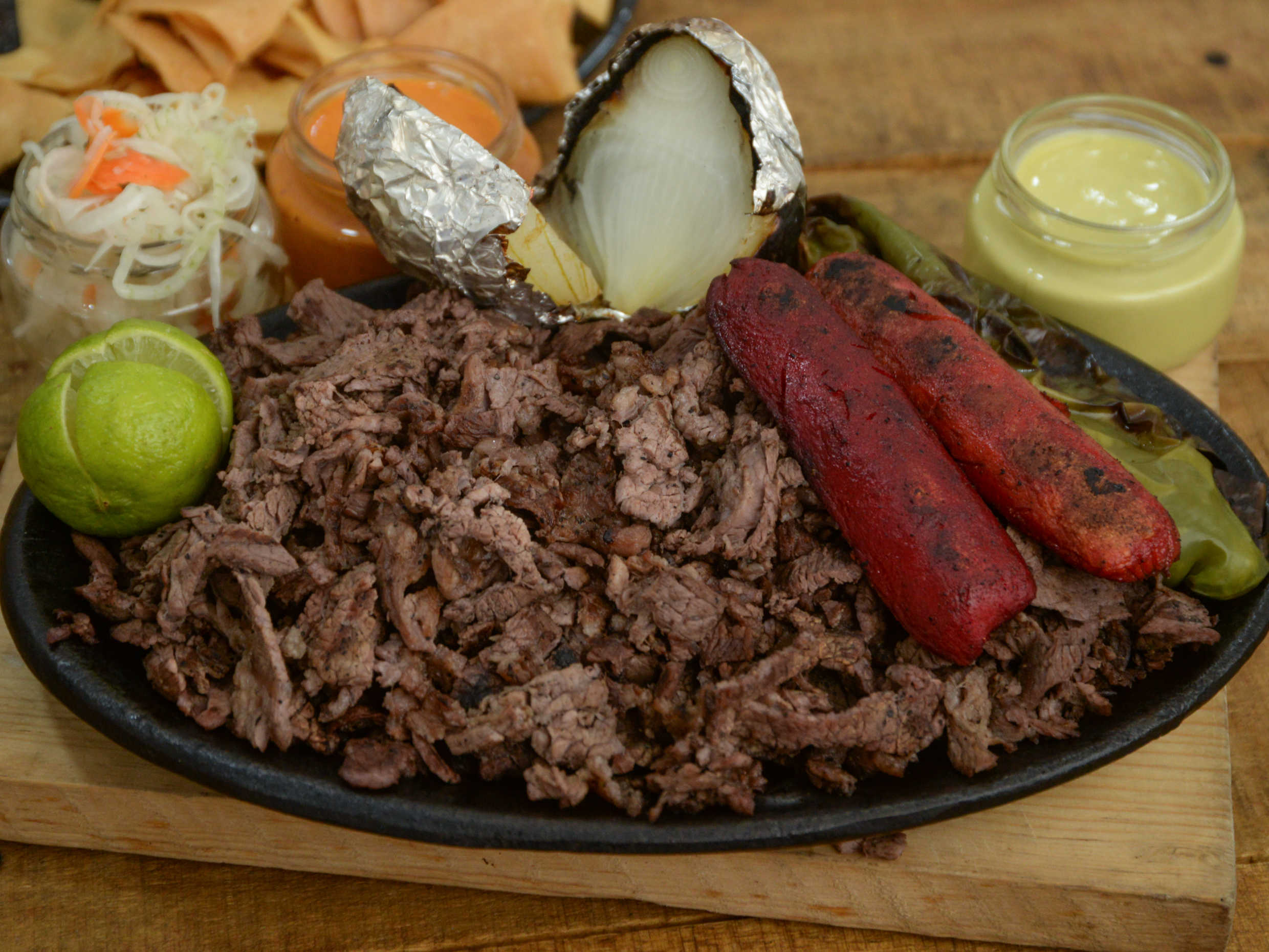 2 Medios kilogramos de carne, 1 cebollita asada, 1 chilaca asado, 1 salchicha asada, 1 papa asada, 1/2 litro de frijoles charros, 2 quesadillas de maíz, 1 porción de verduras y refresco de 2 litros.
