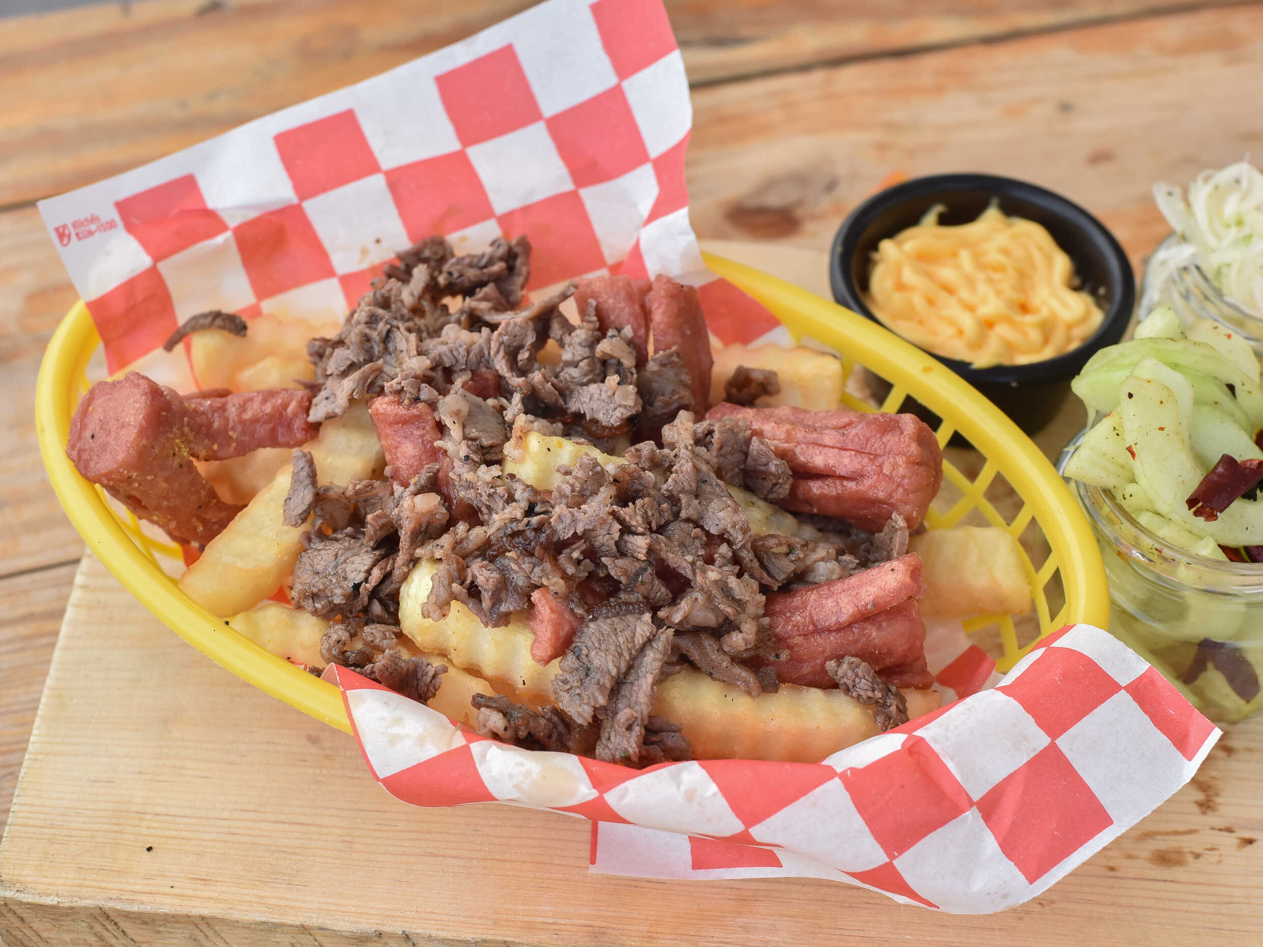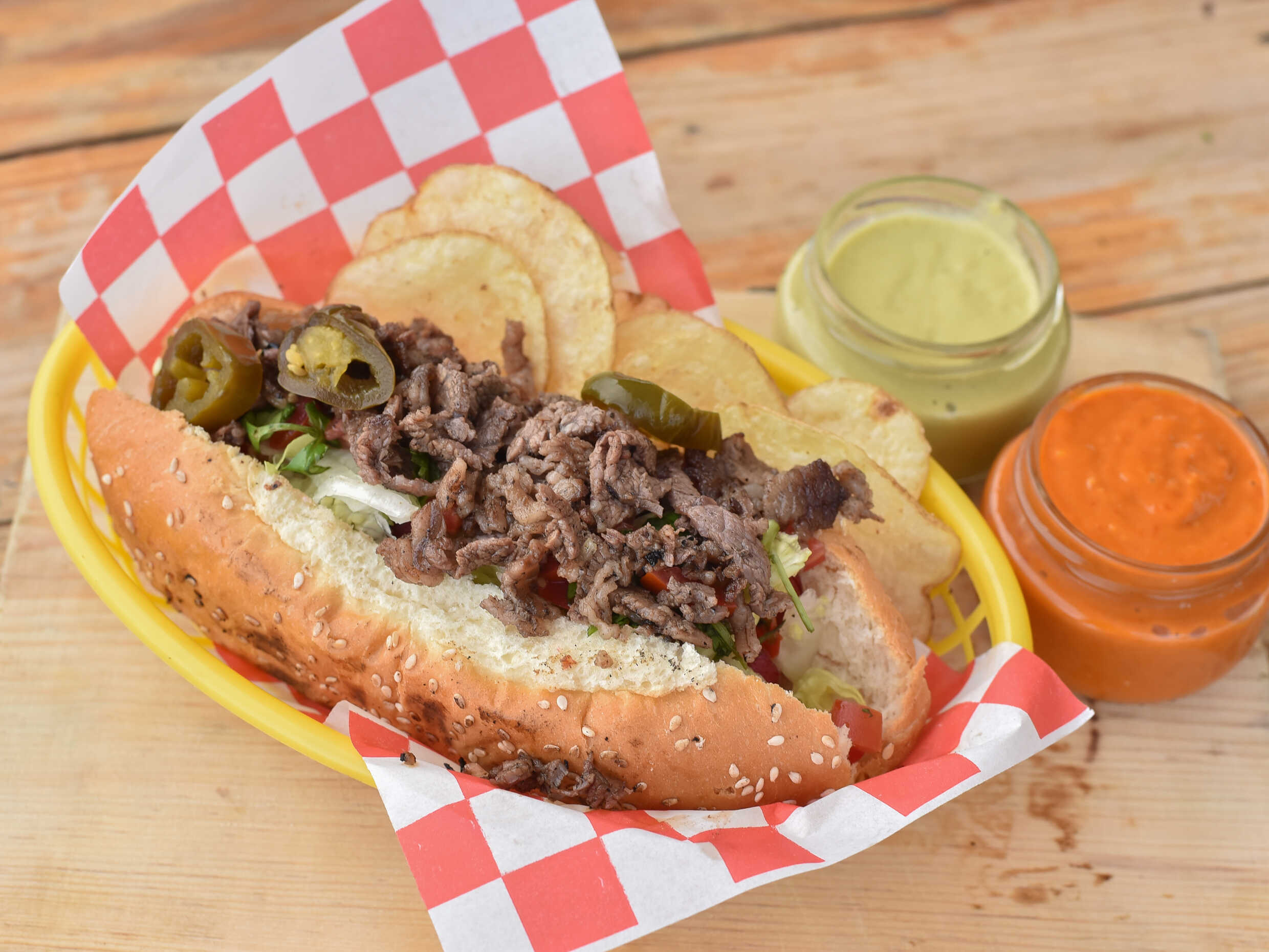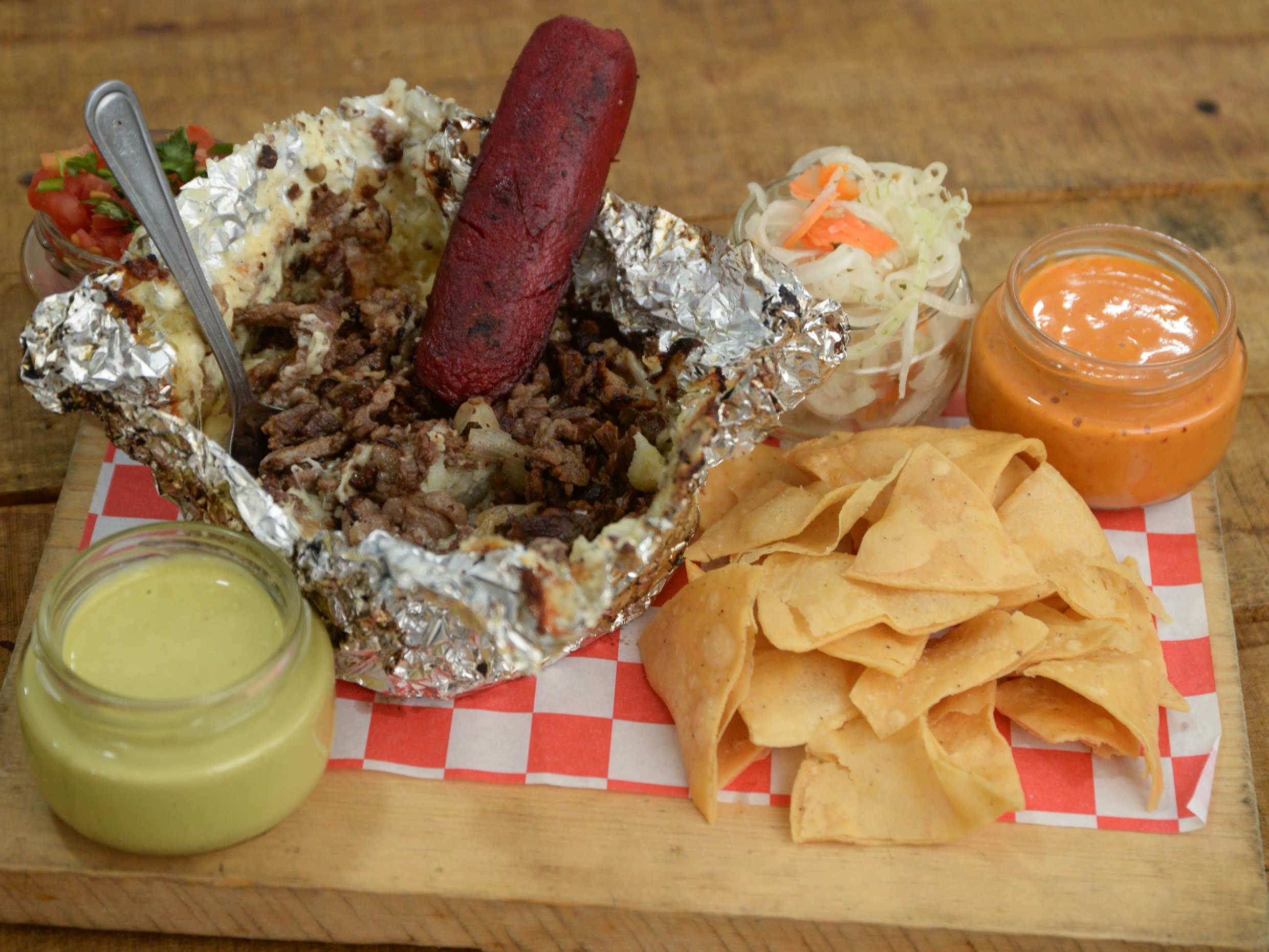 Salchicha para asar rellena de queso chihuahua, envuelta en tocino, porción de carne asada mas aderezo queso amarillo y porción de papas Sabritas.