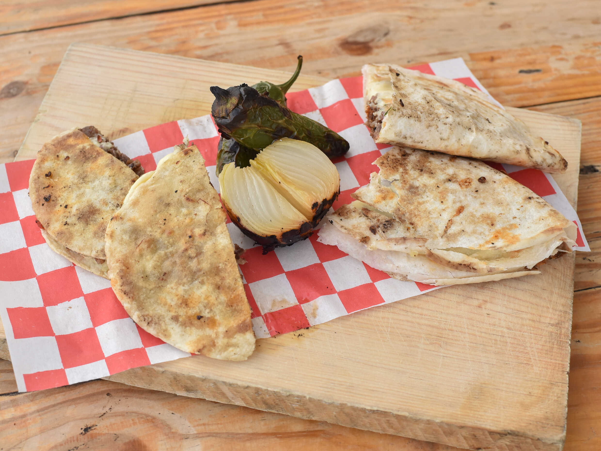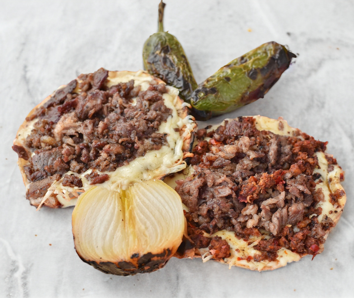 Preparadas con queso chihuahua, carne asada, acompañada de pico de gallo y cebollita asada.
