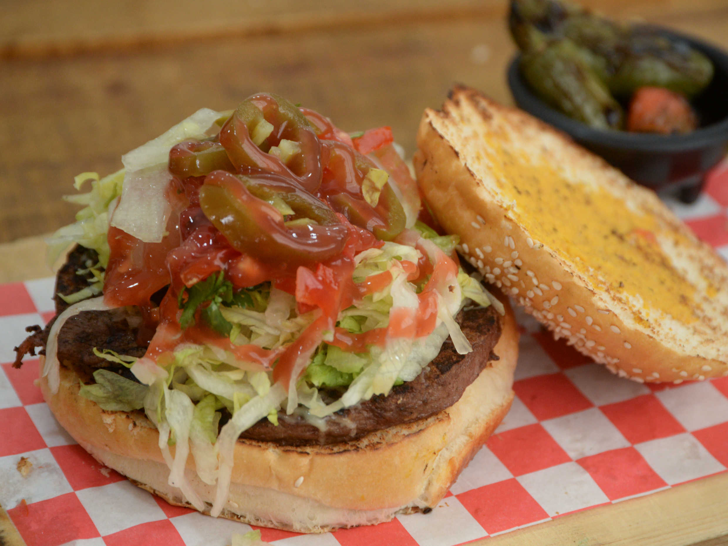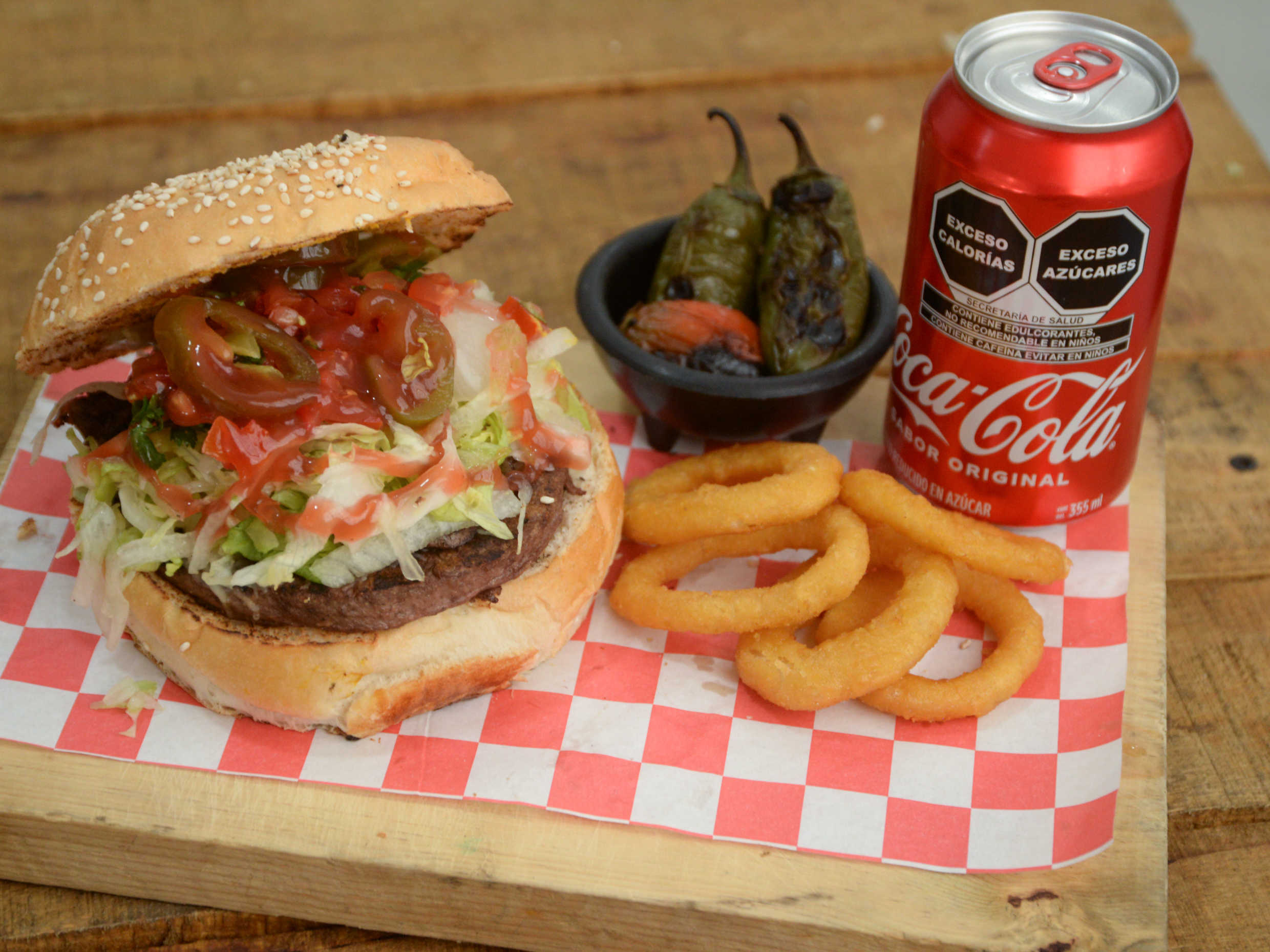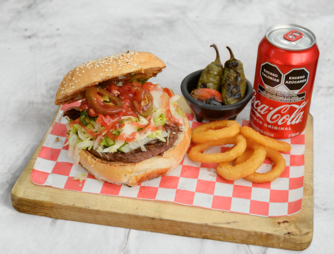 Hamburguesa preparada con carne de sirloin, acompañada de queso chihuahua, porción de carne asada, pico de gallo, cebollita asada y sus aderezos.
