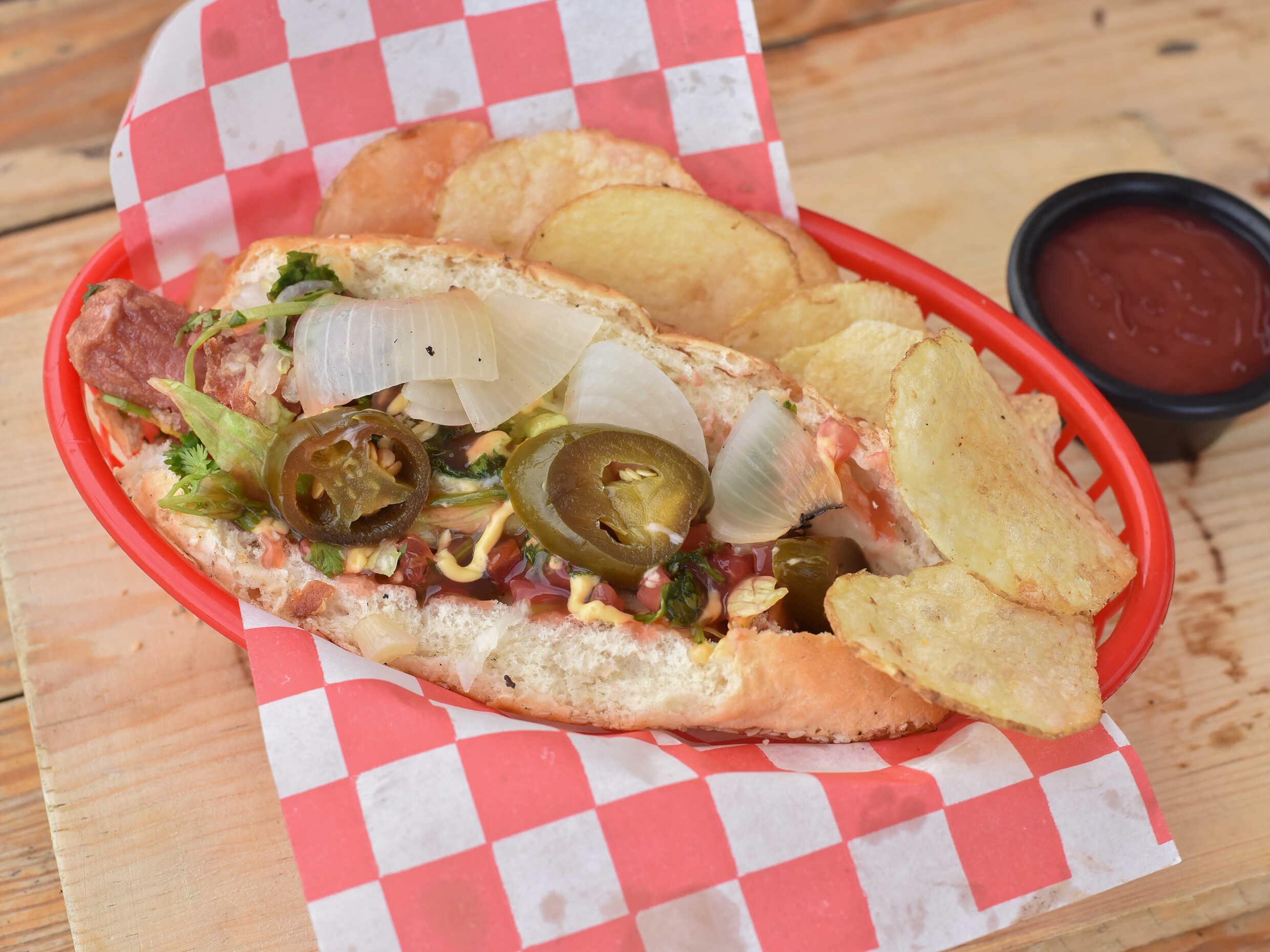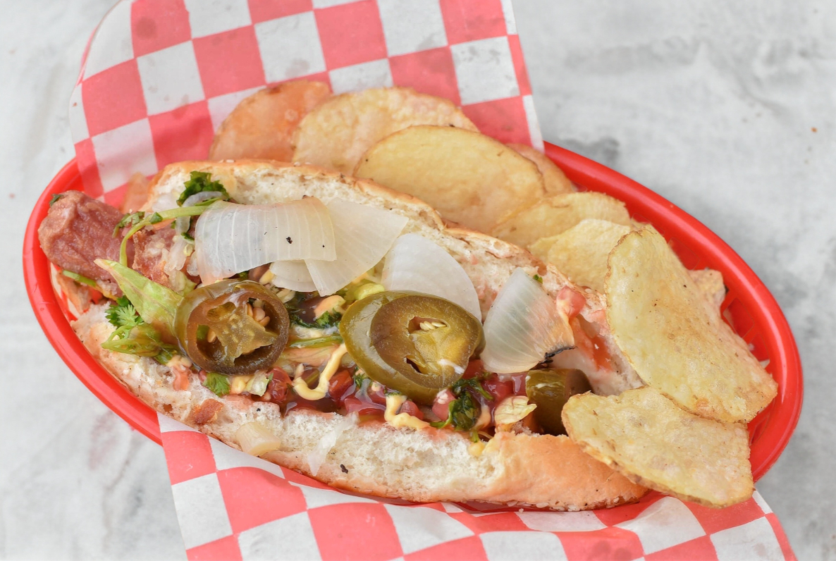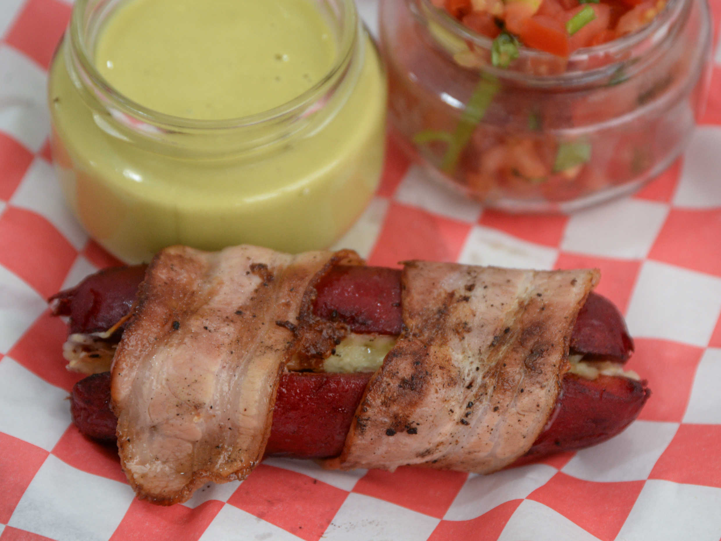 Salchicha de pavo envuelta en tocino, aderezo, queso amarillo y porción de papas Sabritas.