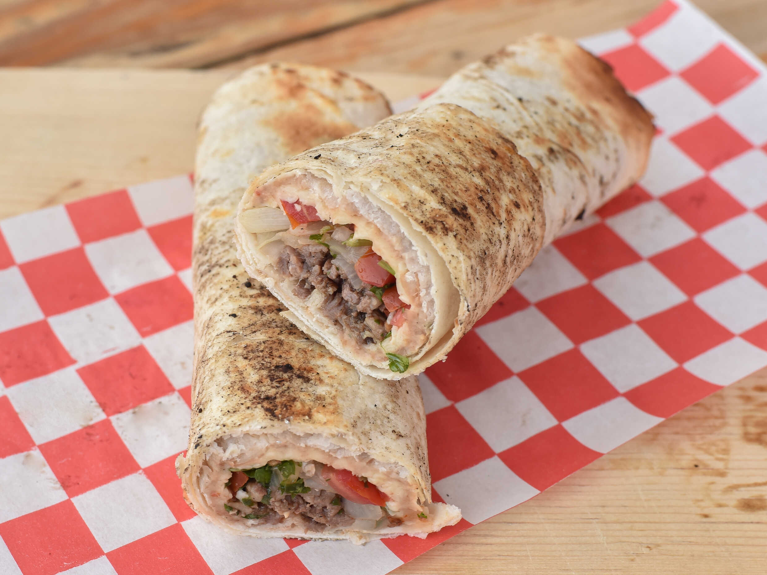 Preparado en tortilla de harina tipo tortillón con carne asada en una cama de frijoles refritos, queso chihuahua, cebollita asada y pico de gallo.