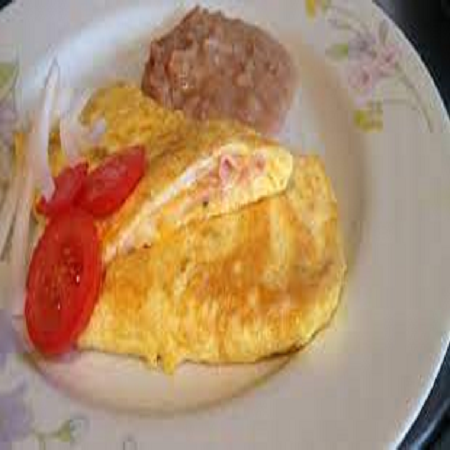 Omelette relleno de queso y jamón acompañado de frijoles .