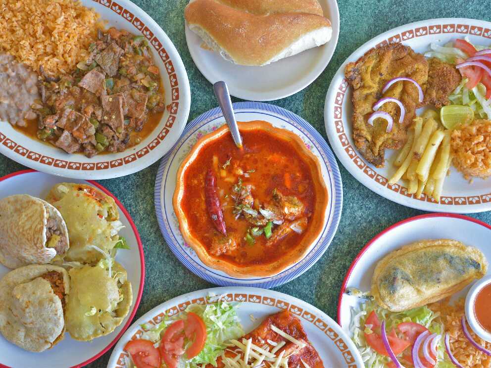 sincronizada de maiz montada en dos huevos estrellados bañados en salsa de tomate con queso y rajas y huevos refritos.