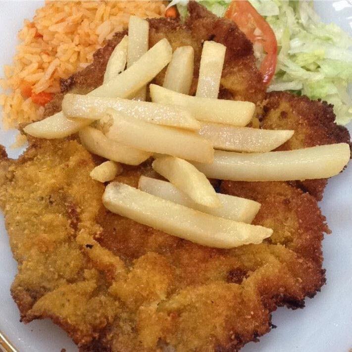 Pechuga de pollo con arroz ensalada y papas a la francesa.