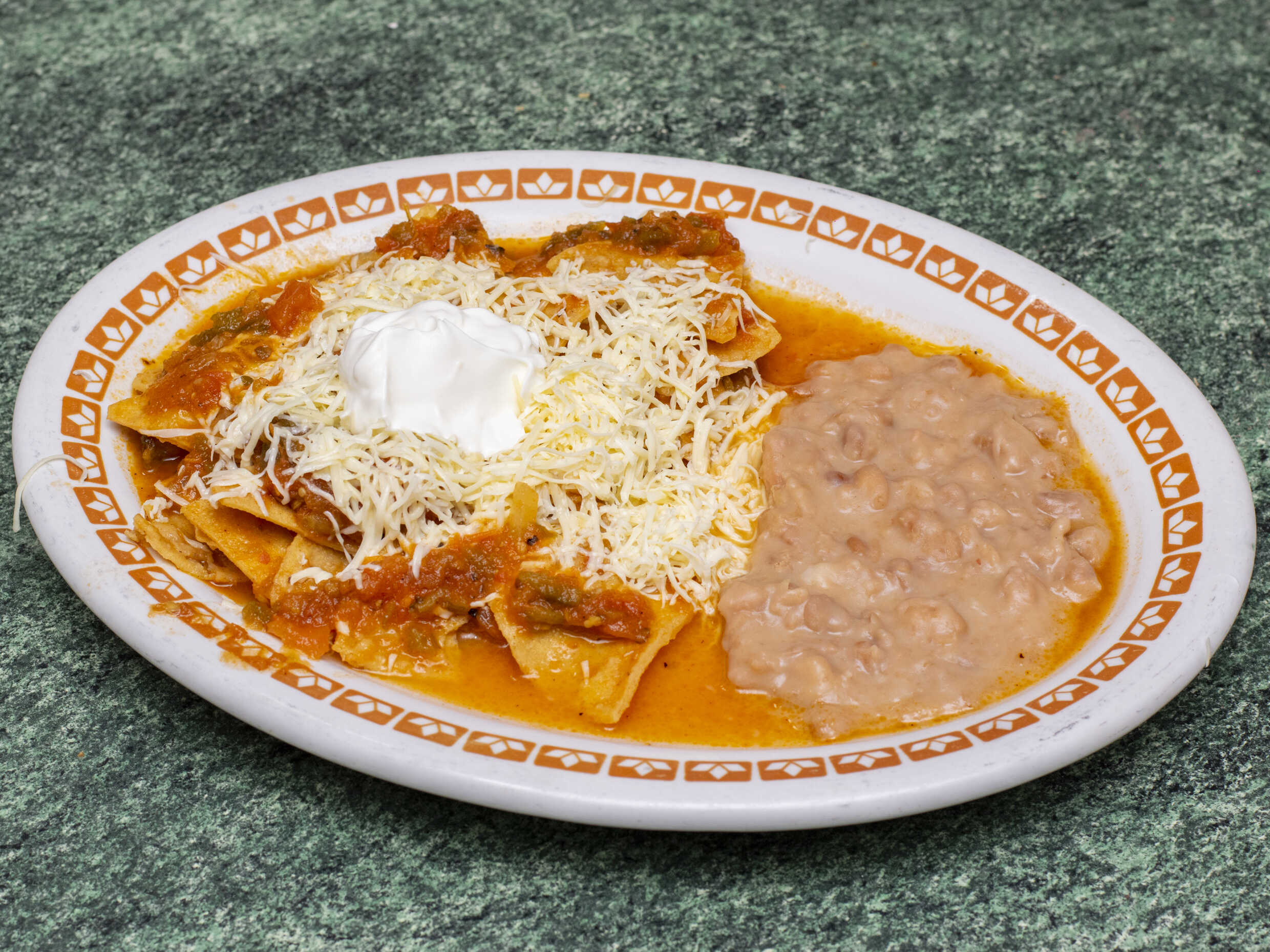 Chilaquiles en nuestra salsa roja con crema ,y queso y frijoles refritos