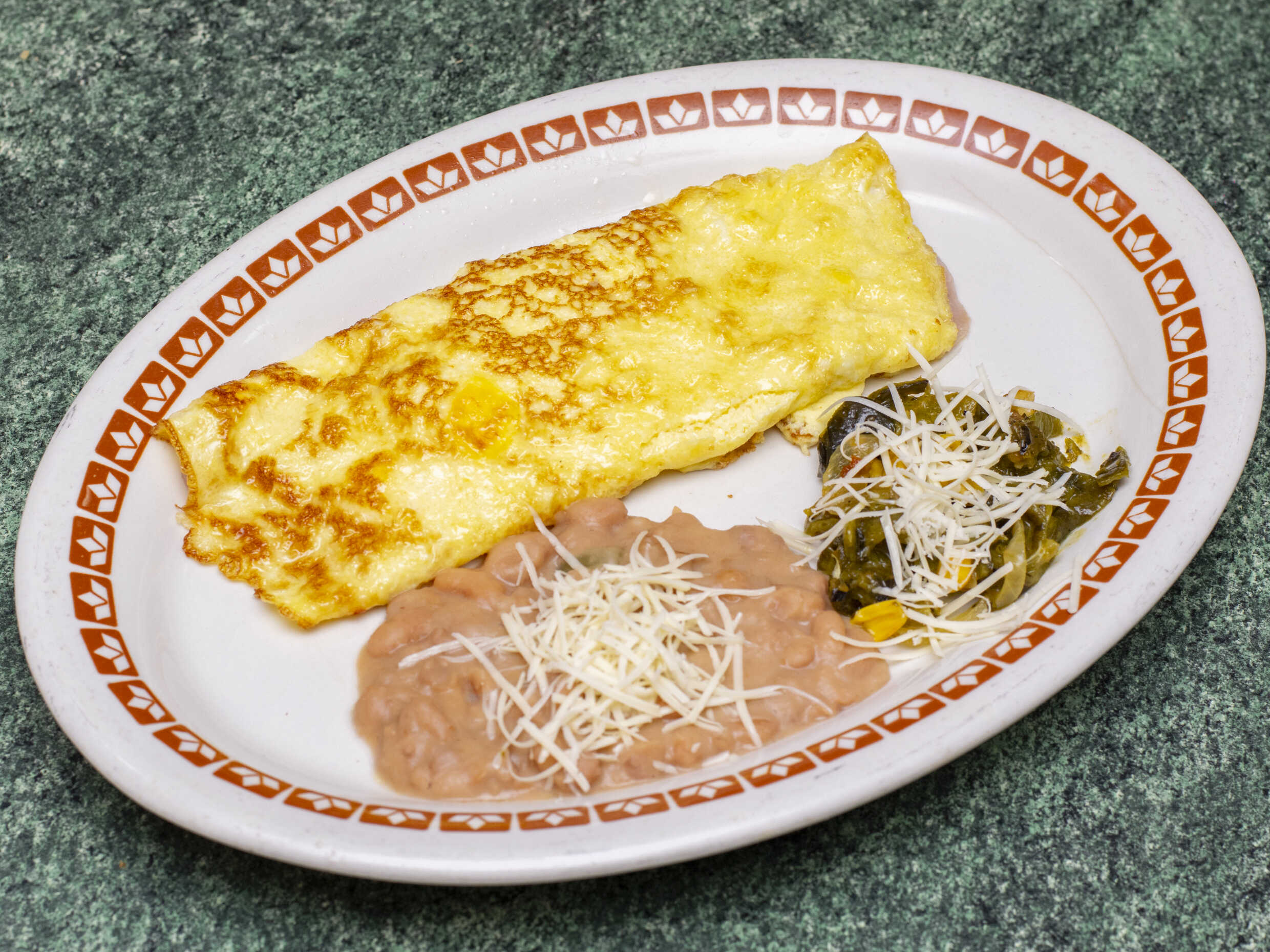 Omelette relleno de queso y jamón acompañado de frijoles .