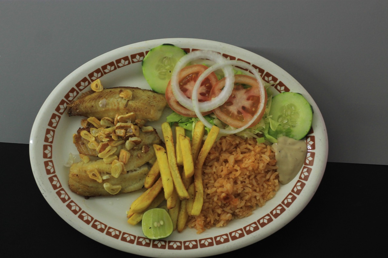 Pescado a la plancha con ajo guarniciones de arroz, papas a la francesa , ensalda y tortillas.