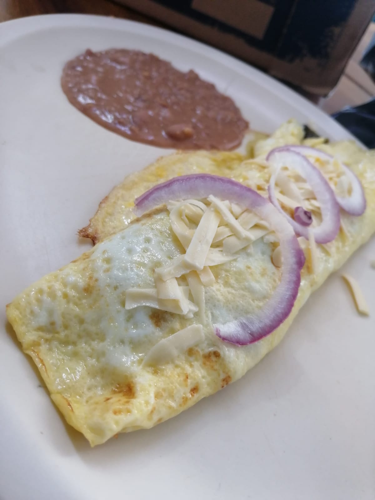 Omelette relleno de queso y jamón acompañado de frijoles .