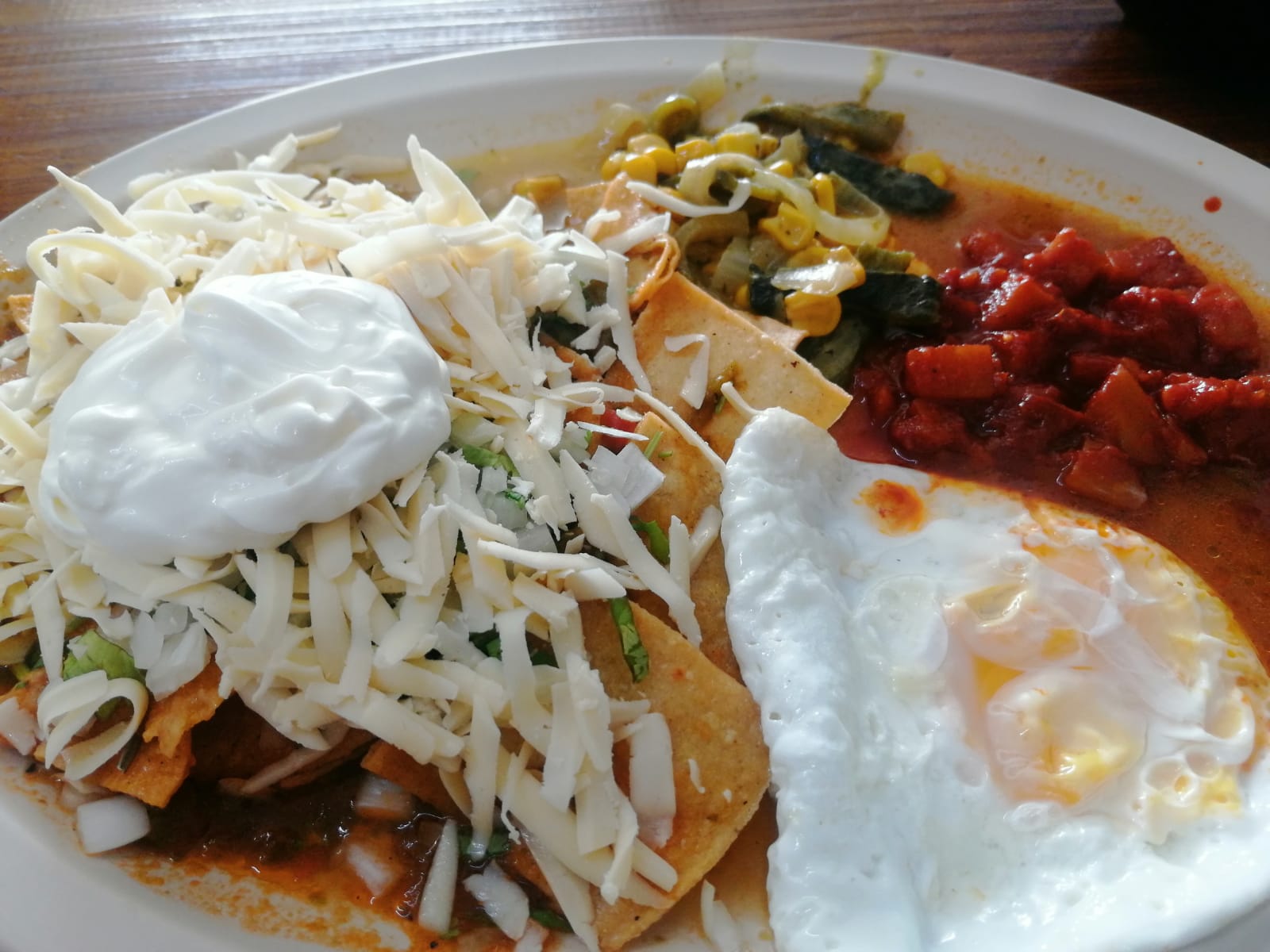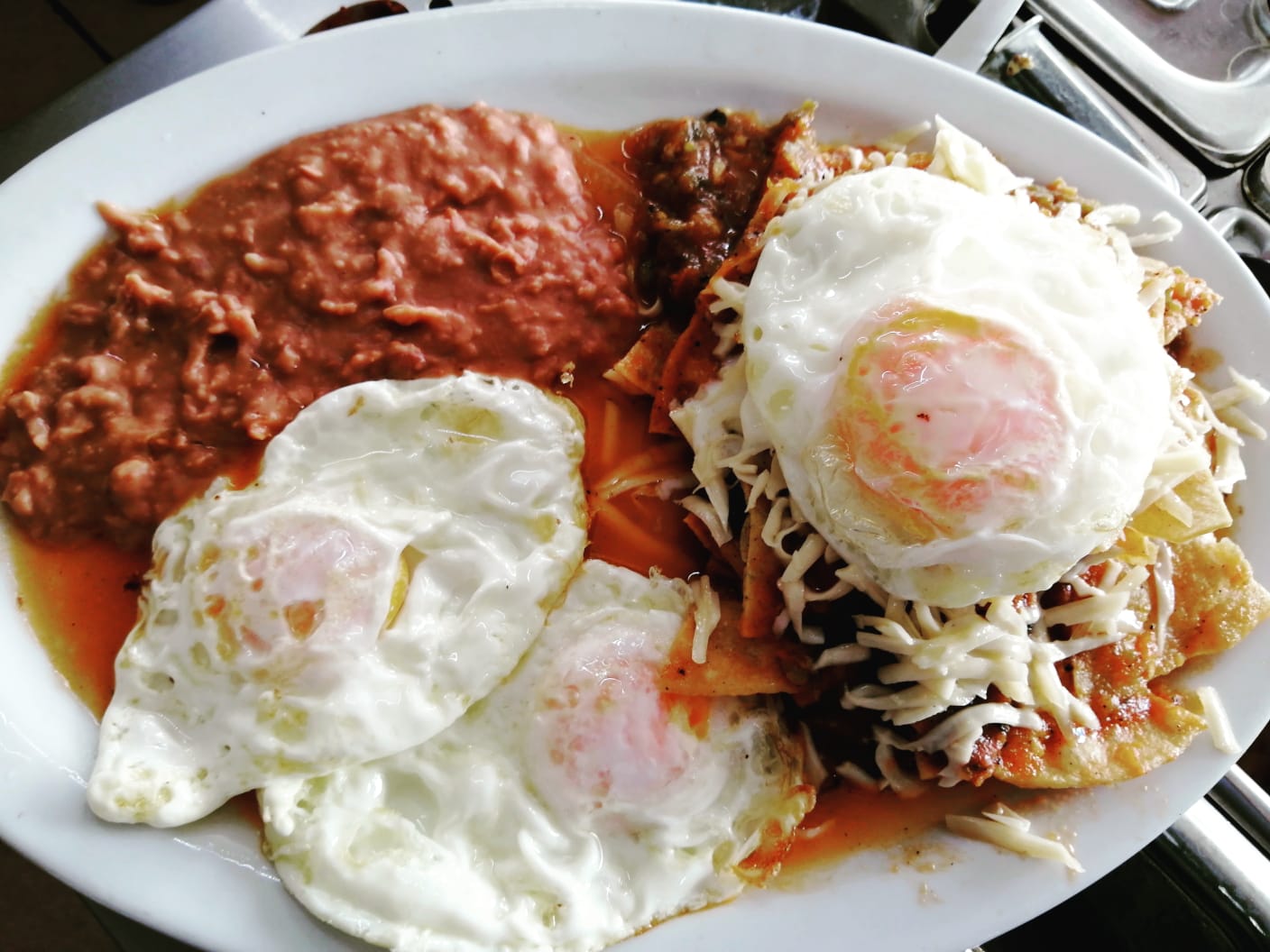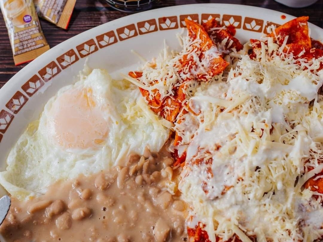 Chilaquiles en salsa roja, crema, queso y frijoles con un huveo estrellado