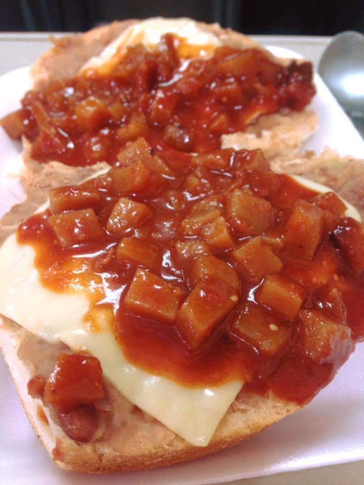 Pan frances con cama de frijoles y huevo con chorizo.