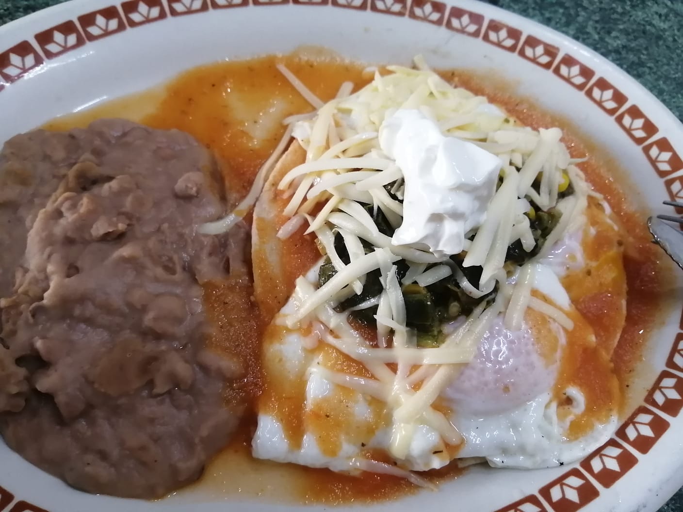 Preparados con salsa verde (tomate y jalapeño verde) o roja con queso crema , un huuvo estrellado guarnición de frijoles.