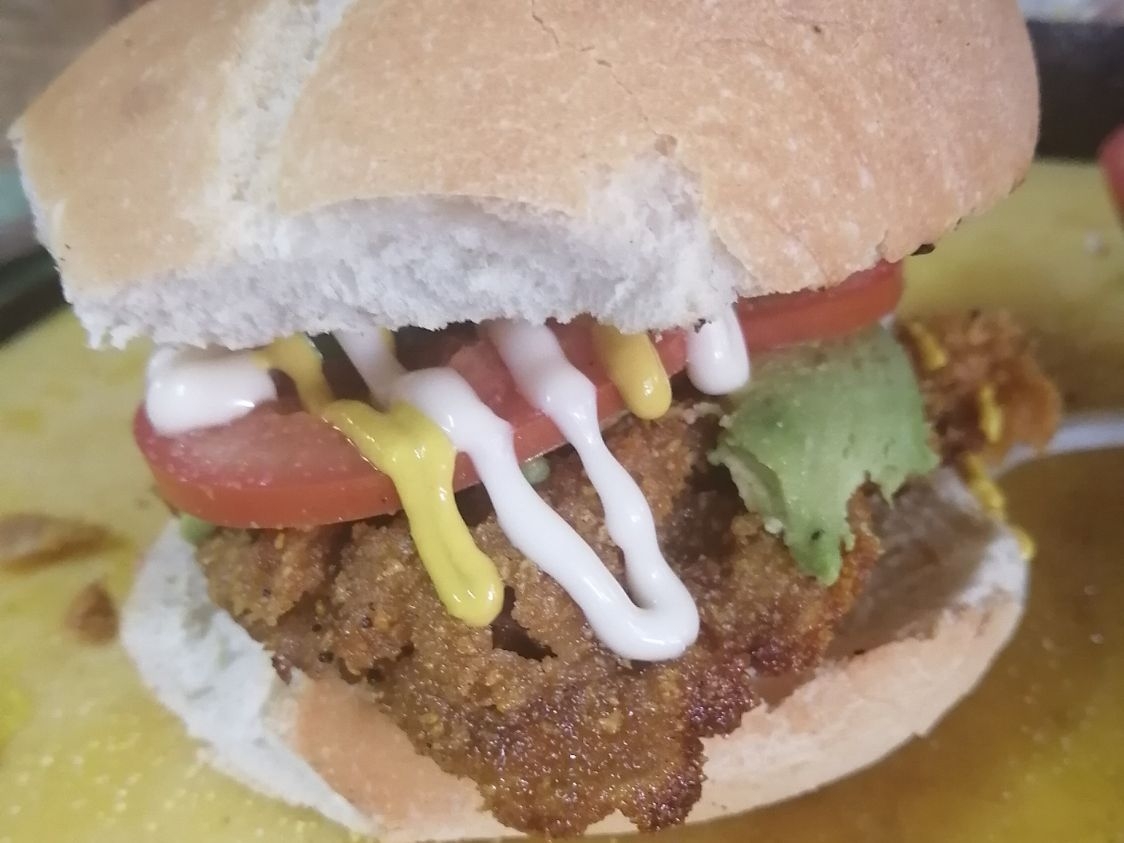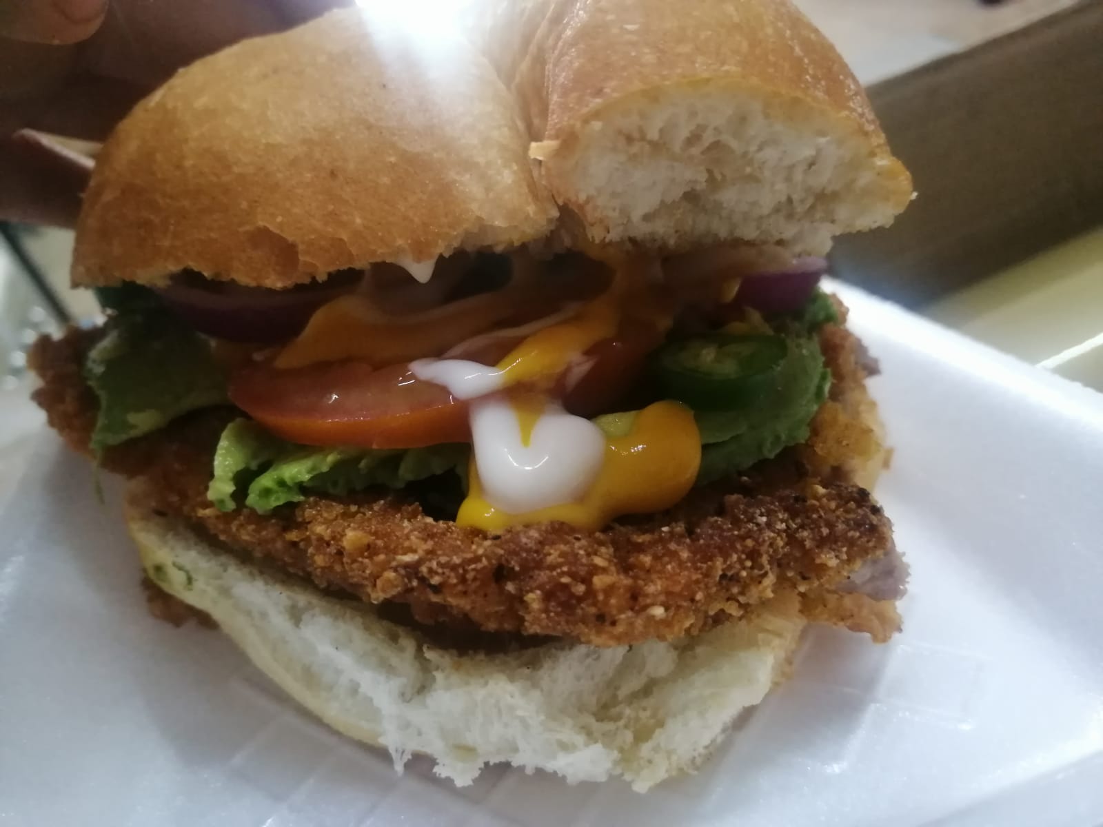 Lonche de milanesa empanizada , con aguacate , cebolla , tomate , chile y aderezos