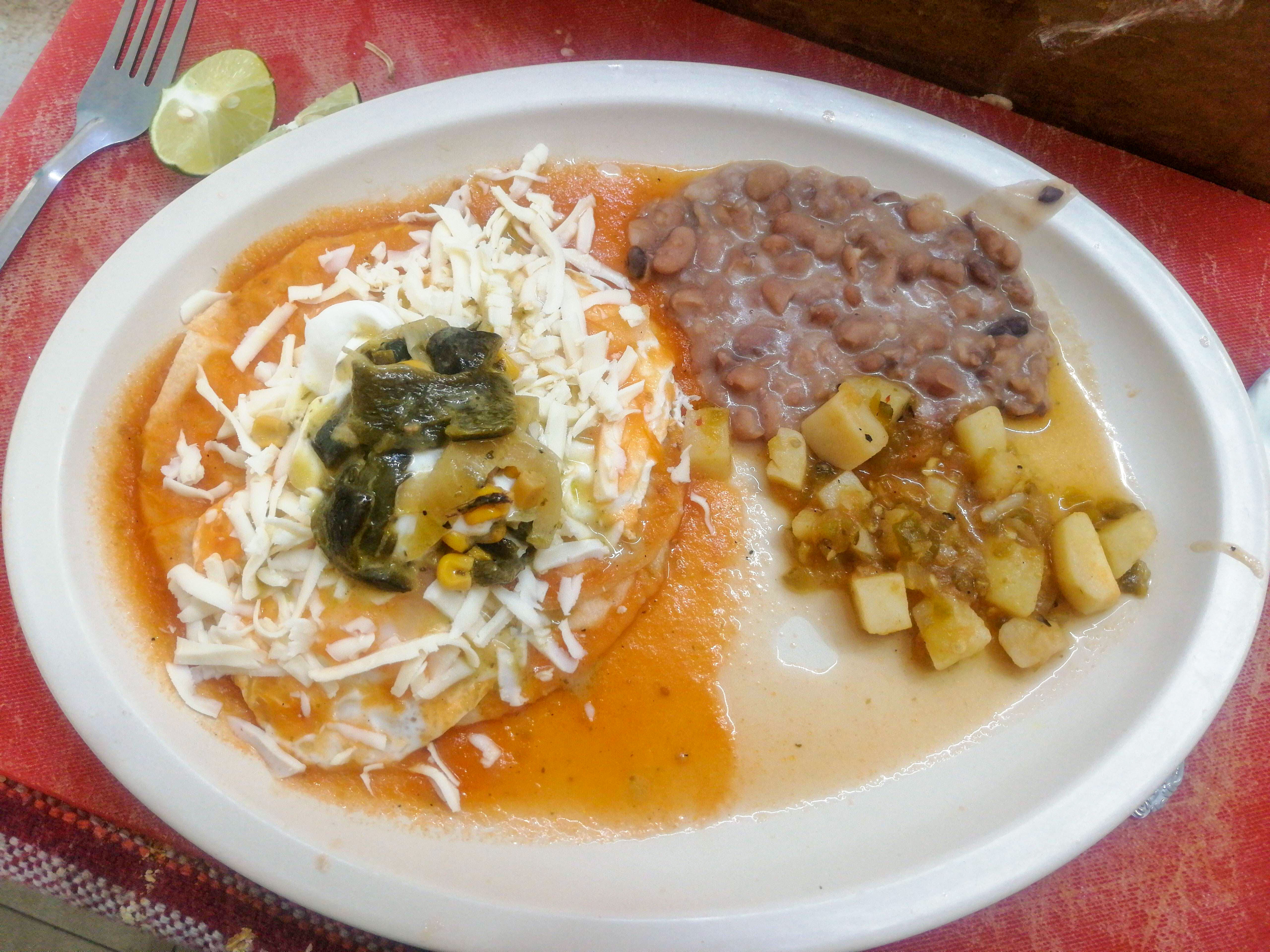 chilaquiles en salsa roja con crema queso y frijoles