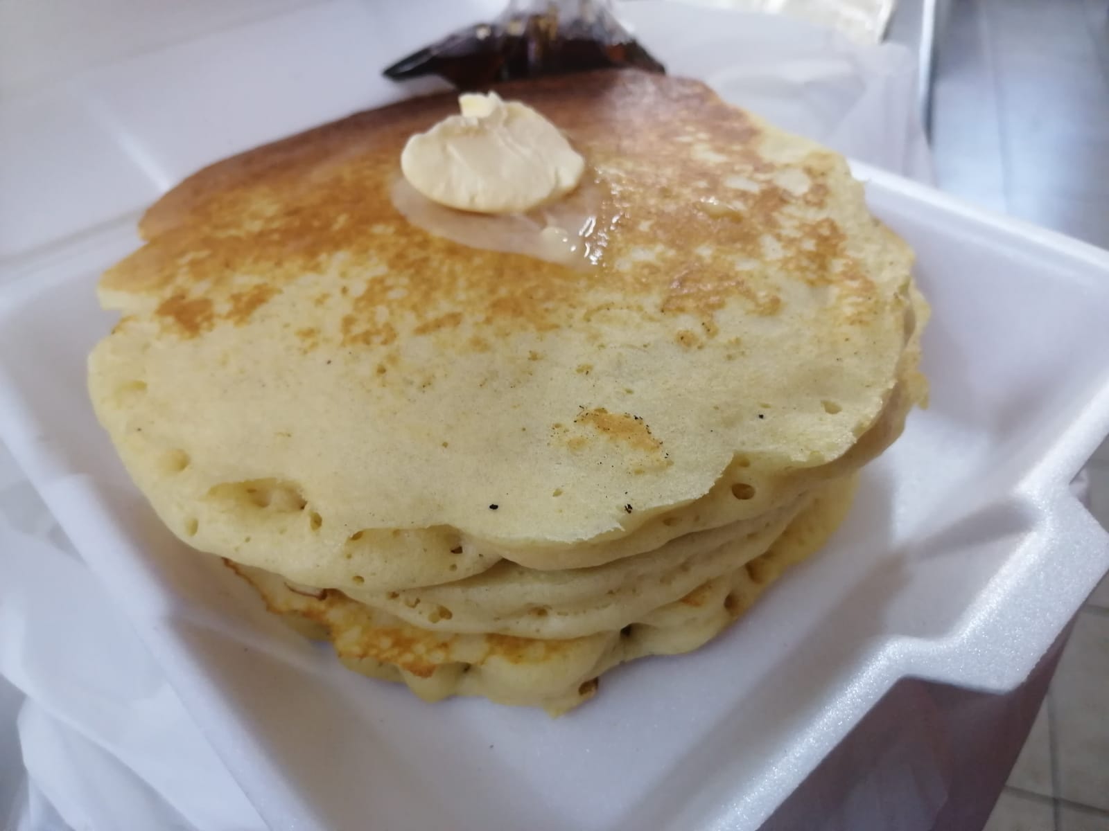 3 Hot cakes con mantequilla y miel maple.