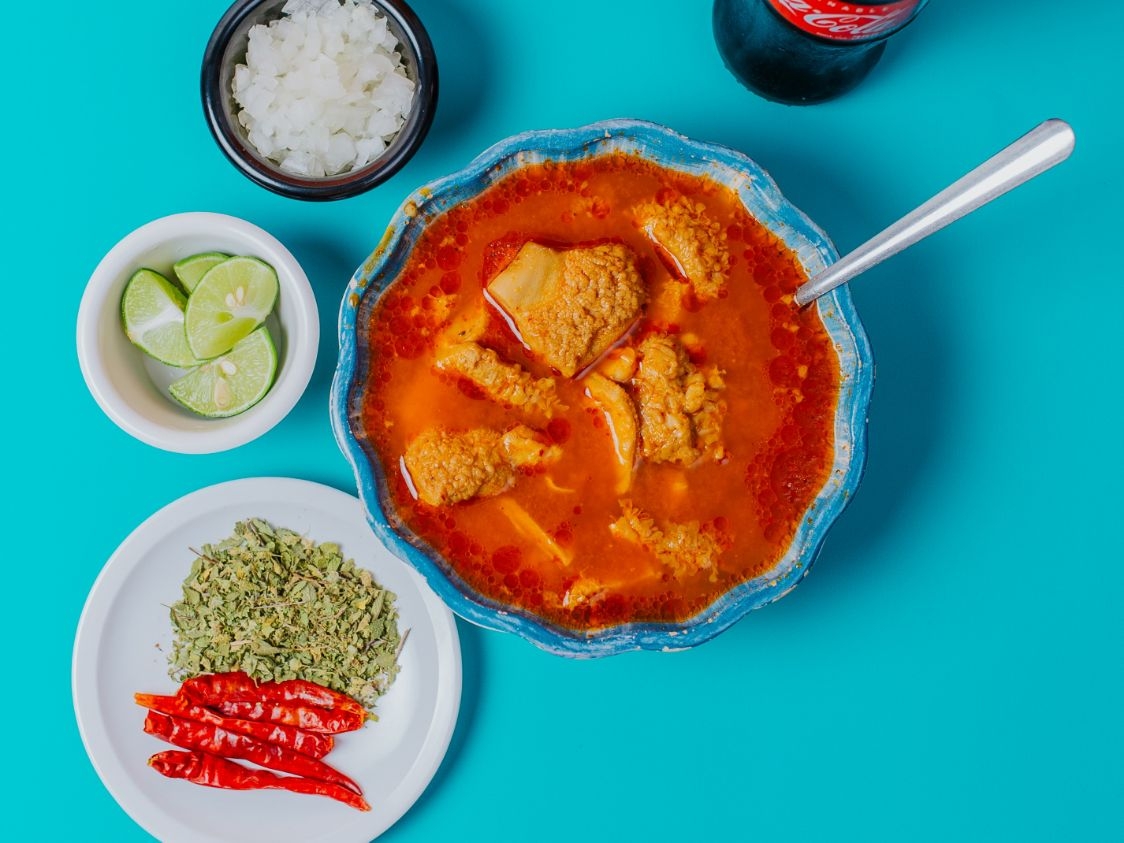 Litro de menudo de puro maiz , pan frances , cebolla , limon , chile y oregano.