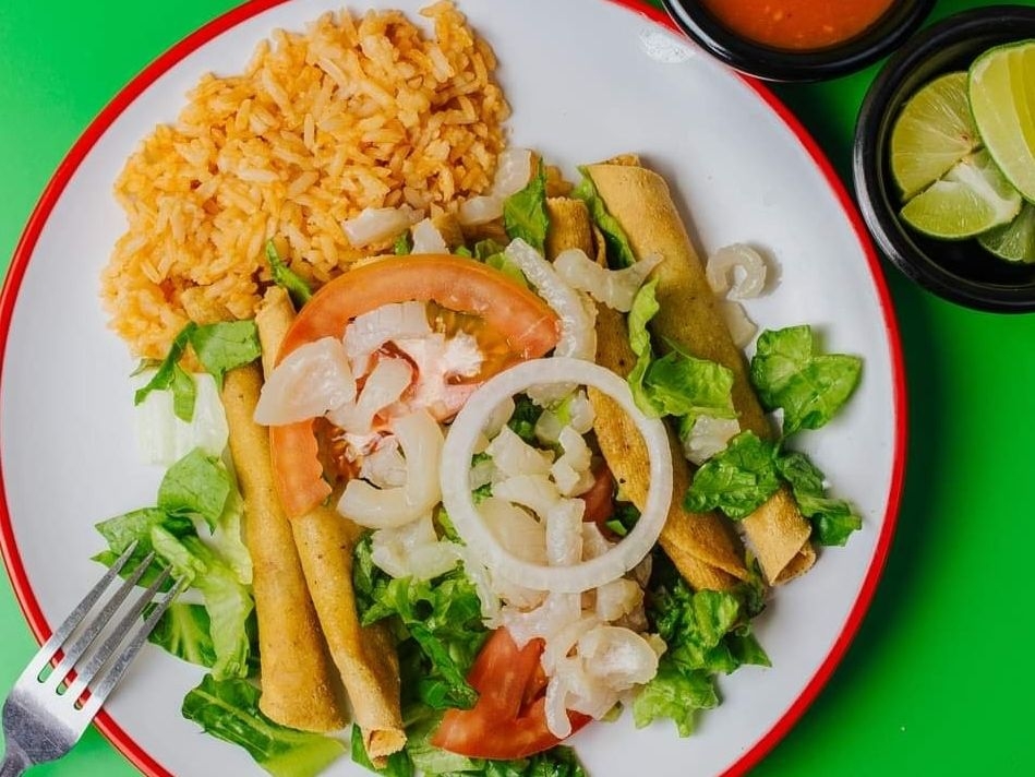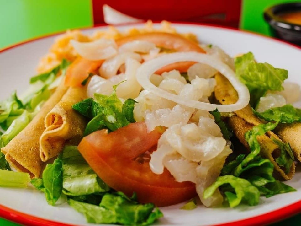 Tacos dorados 2 de papa, 2 de frijoles y 2 de carne acompañados de lechuga, tomate , cueritos.