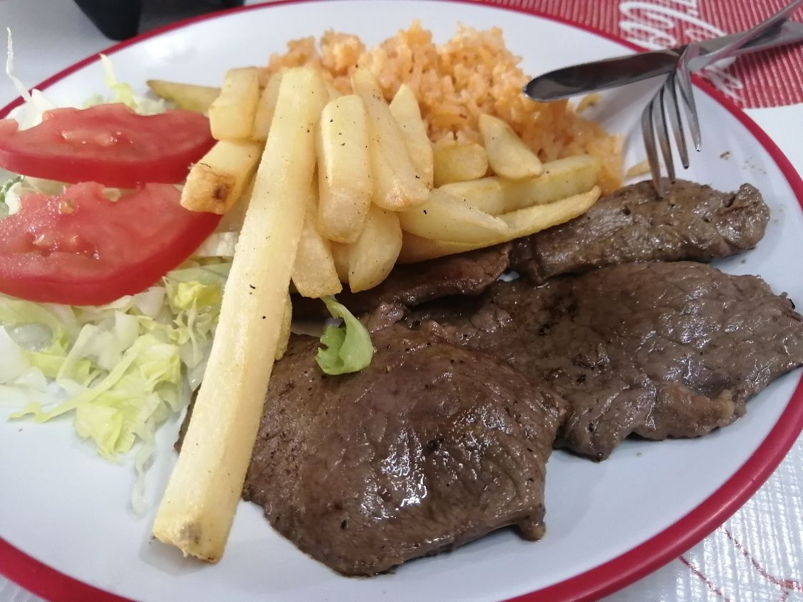 Bistec a la plancha con papas a la francesa, arroz, ensalada, tortillas y salsa.