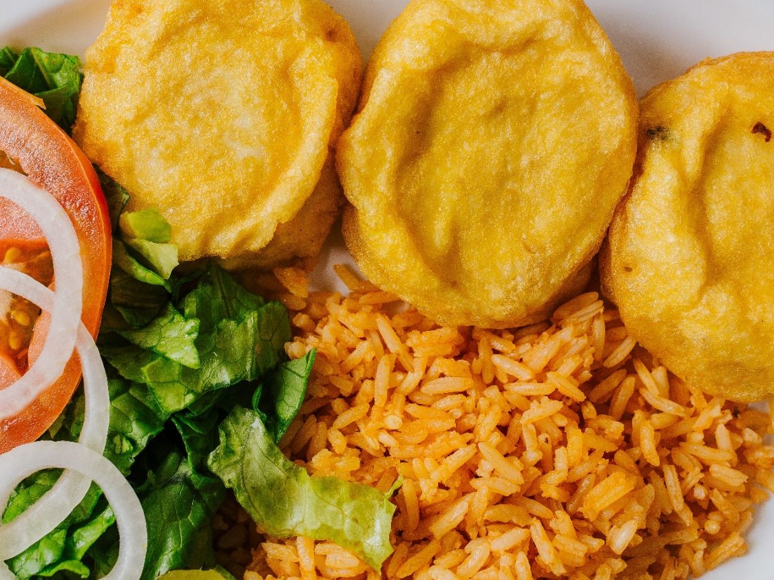 3 piezas de tortitas de papa acompañadas de arroz, ensalada, tortillas y salsa.