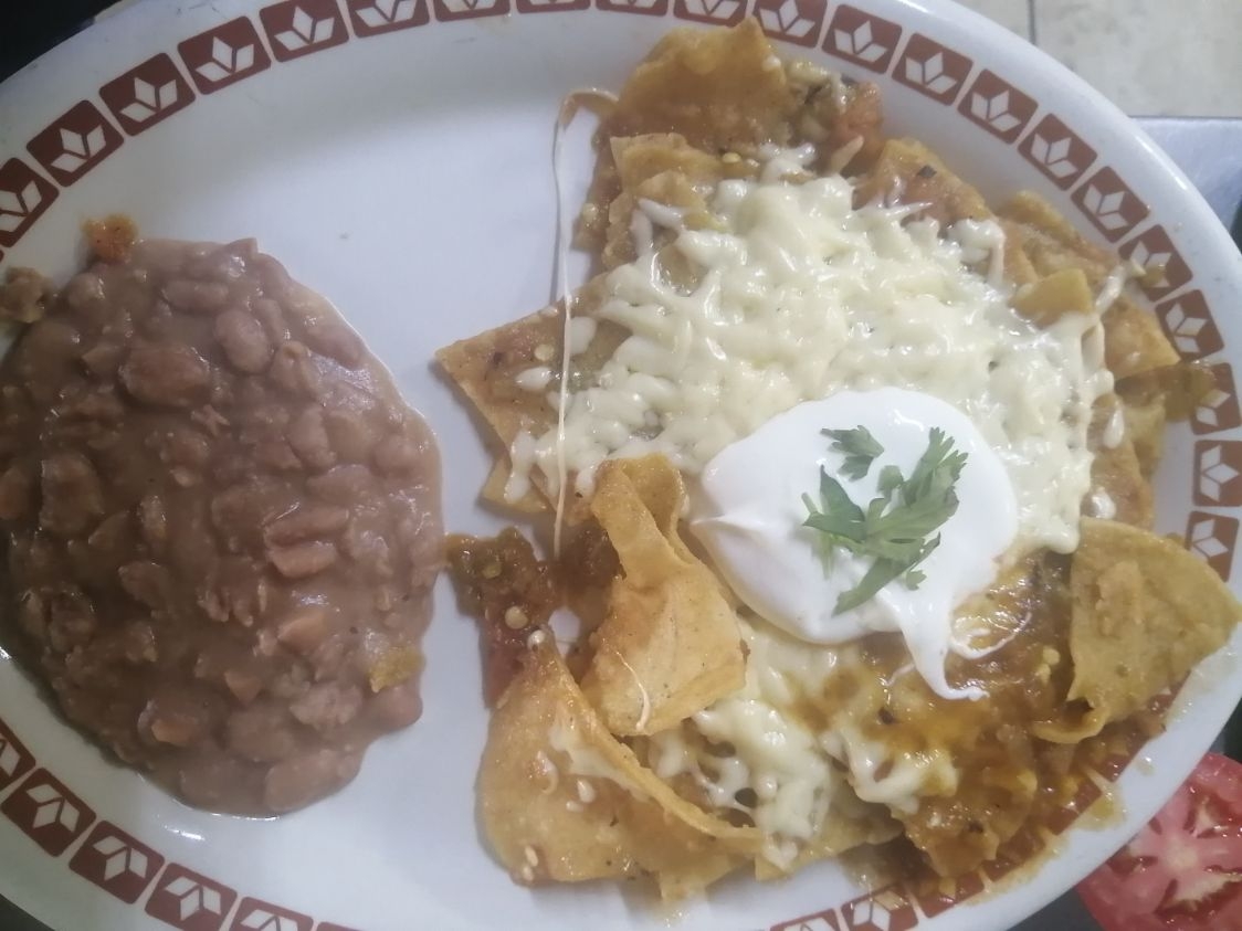 Chilaquiles en jalapeño verde con tomate , con queso y crema y frijolitos.