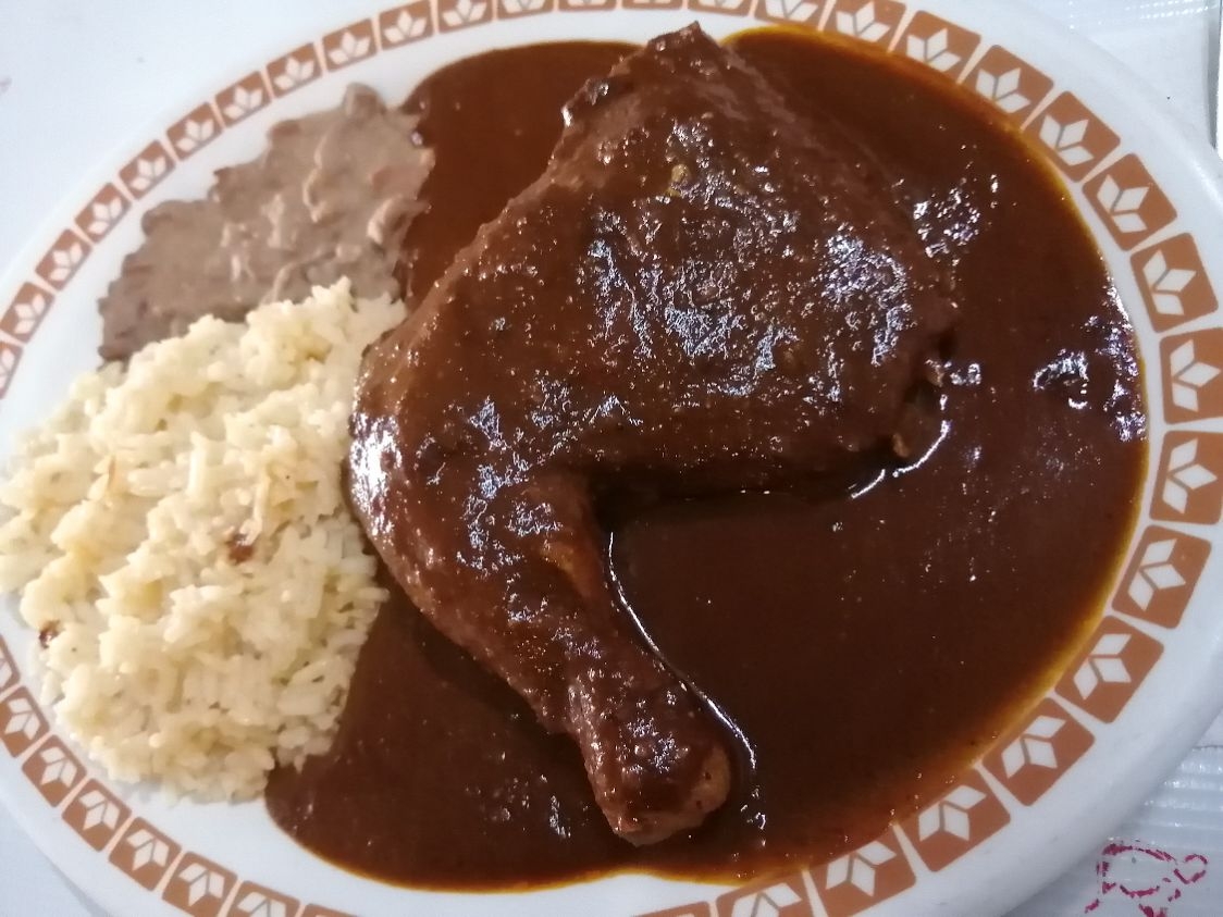 Pasta de mole de la casa con pollo arroz y frijoles