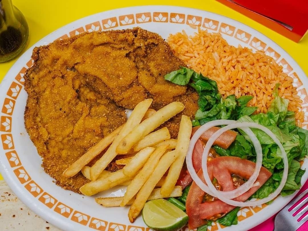 Bistec empanizado acompañado de papas a la francesa, arroz, ensalada , tortillas y salsa.