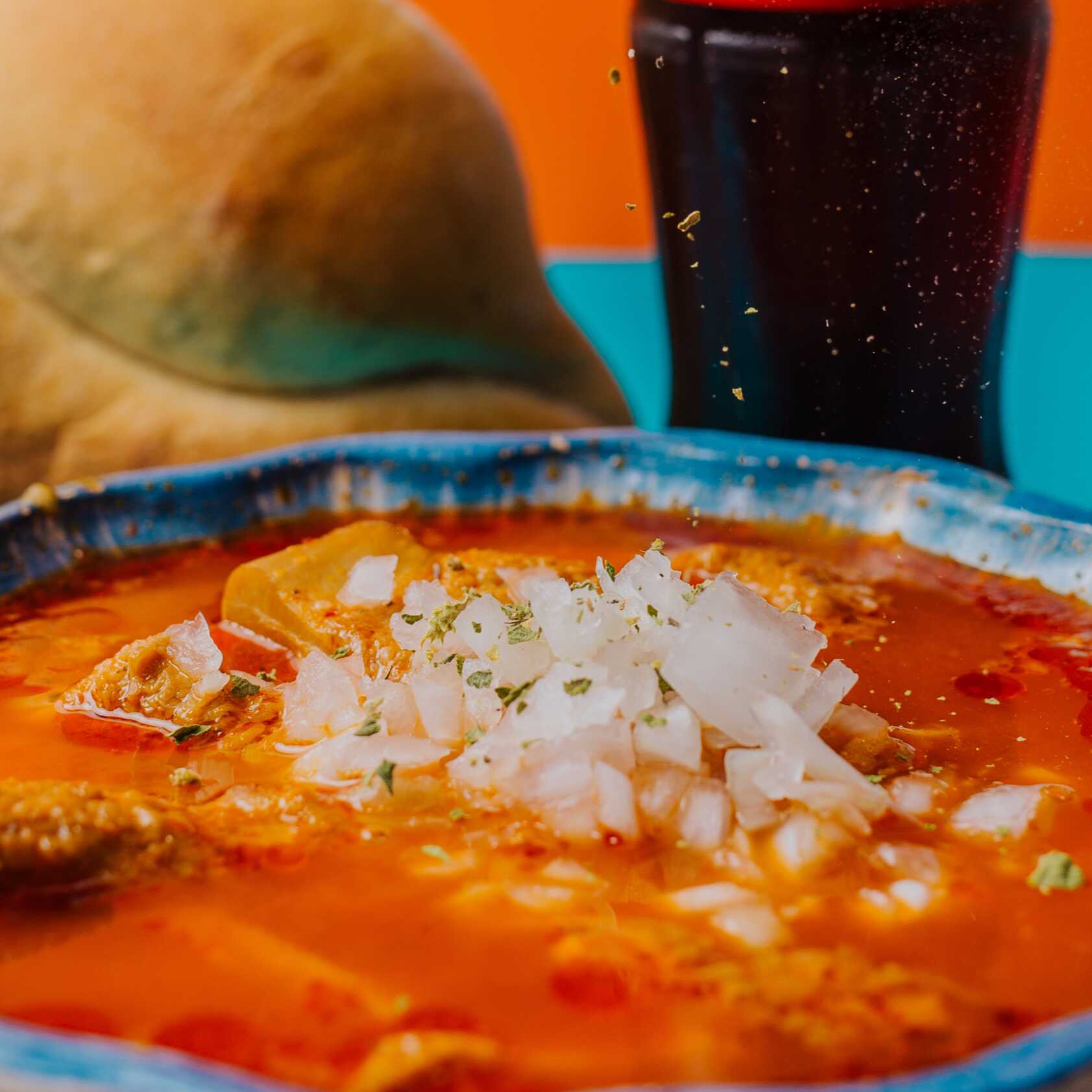Litro de menudo con carne y maiz, cebolla , limon , oregano , chile de arbol y una pieza de pan frances.