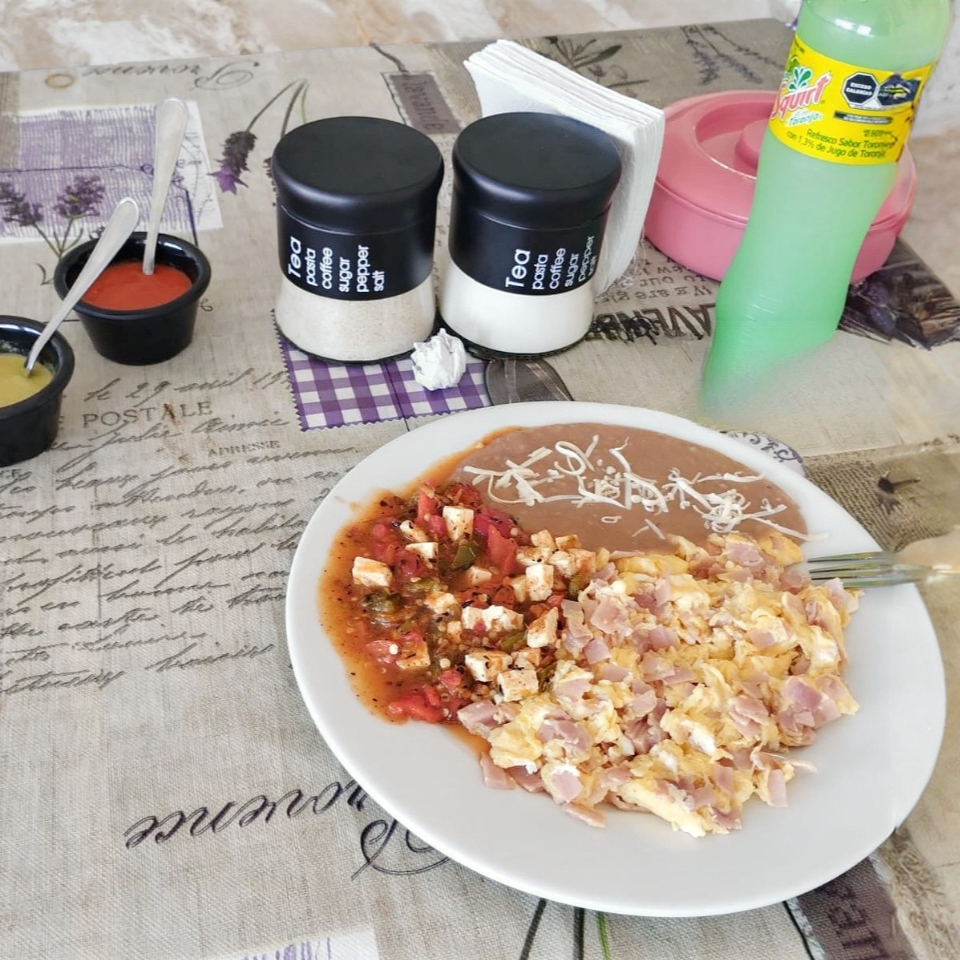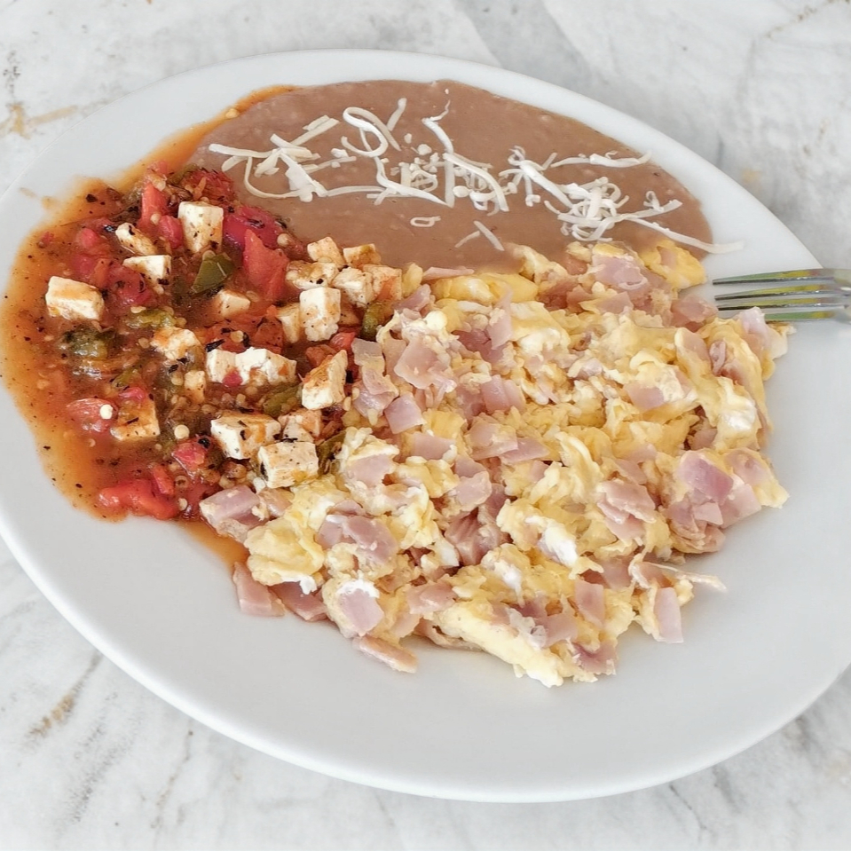 Huevos con jamón con guiso frijoles y tortillas.