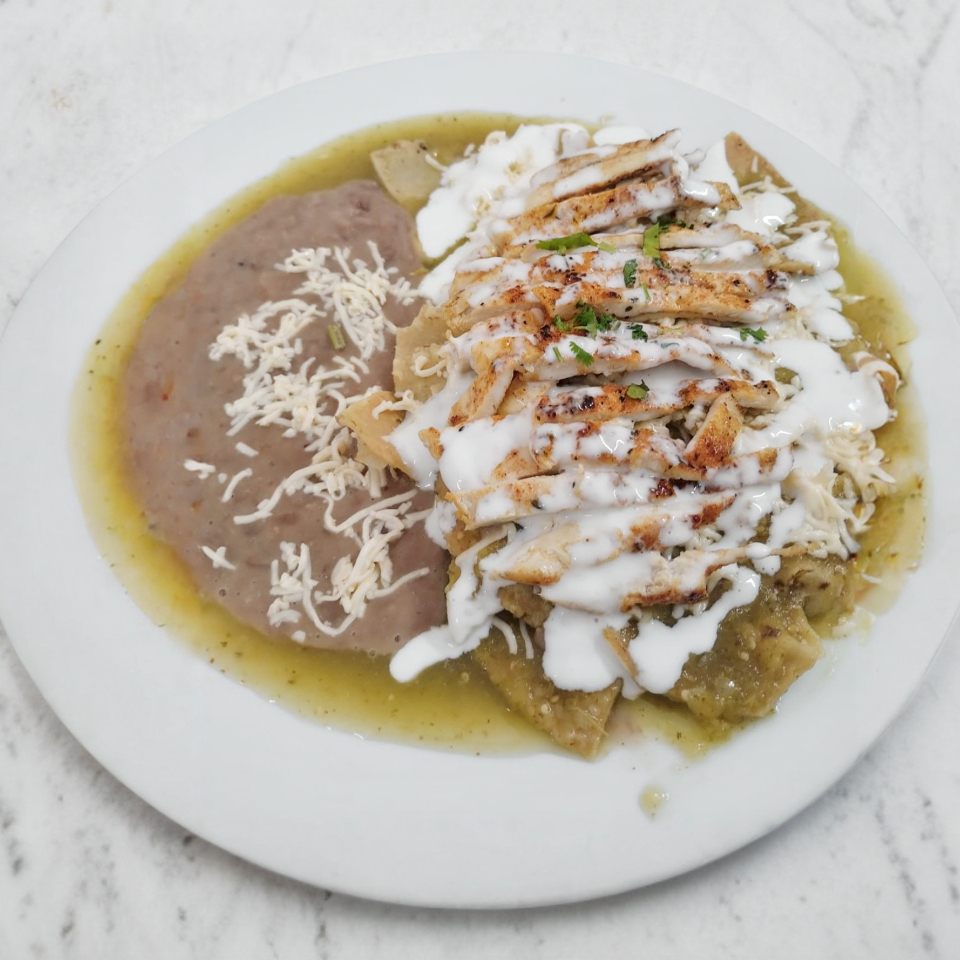 Chilaquiles con salsa de su preferencia con crema y delicioso pollo a la plancha incluye frijoles