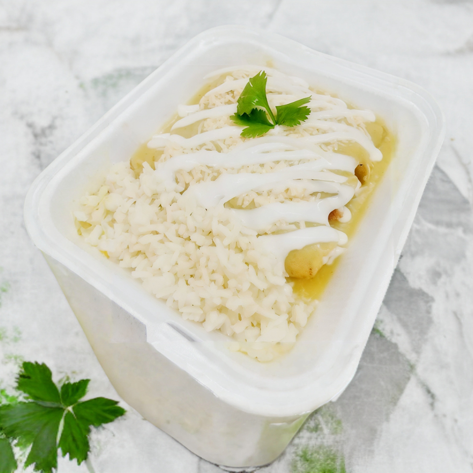4 deliciosas enchiladas de pollo bañadas en salsa suiza queso encima y acompañado de arroz blanco con el toque de la casa