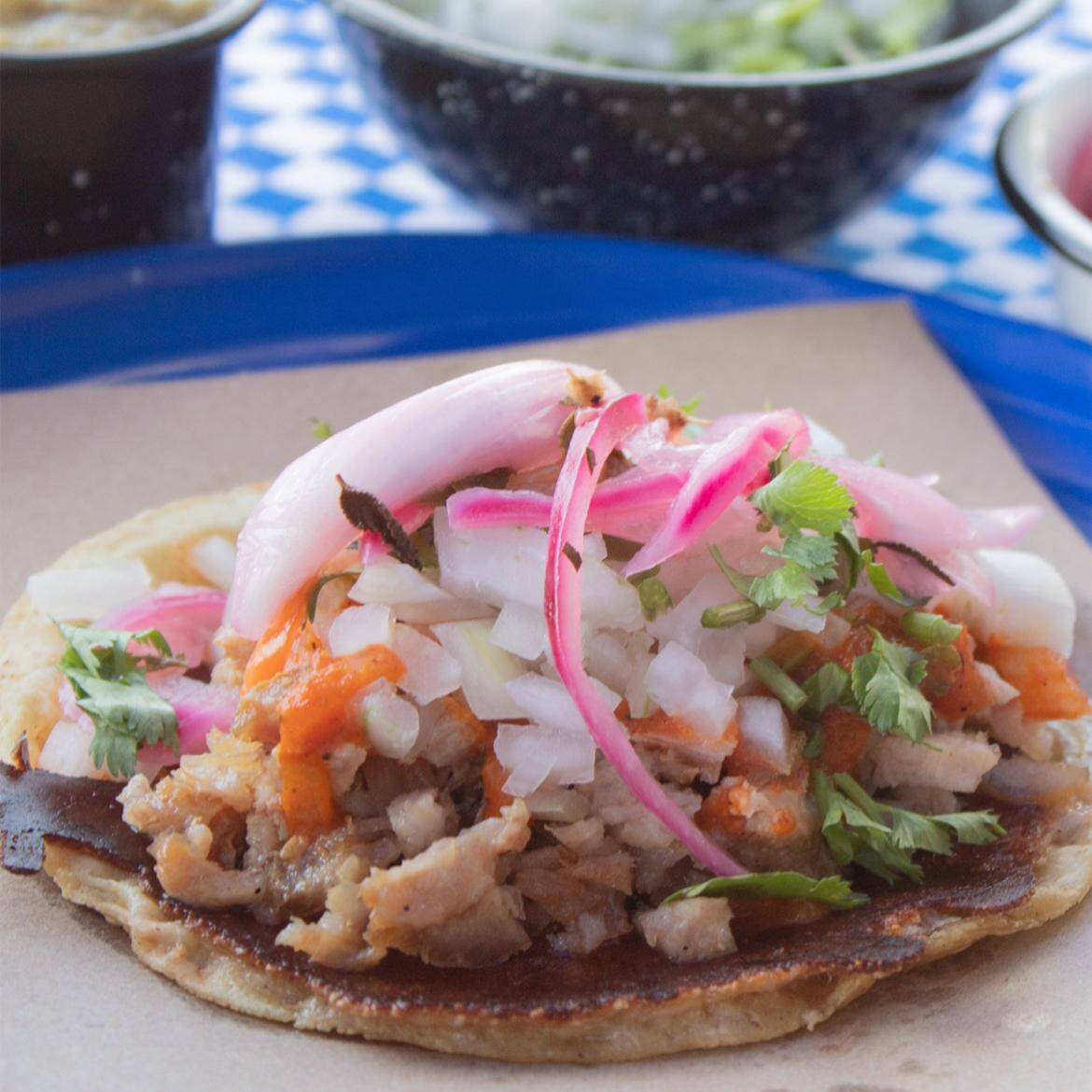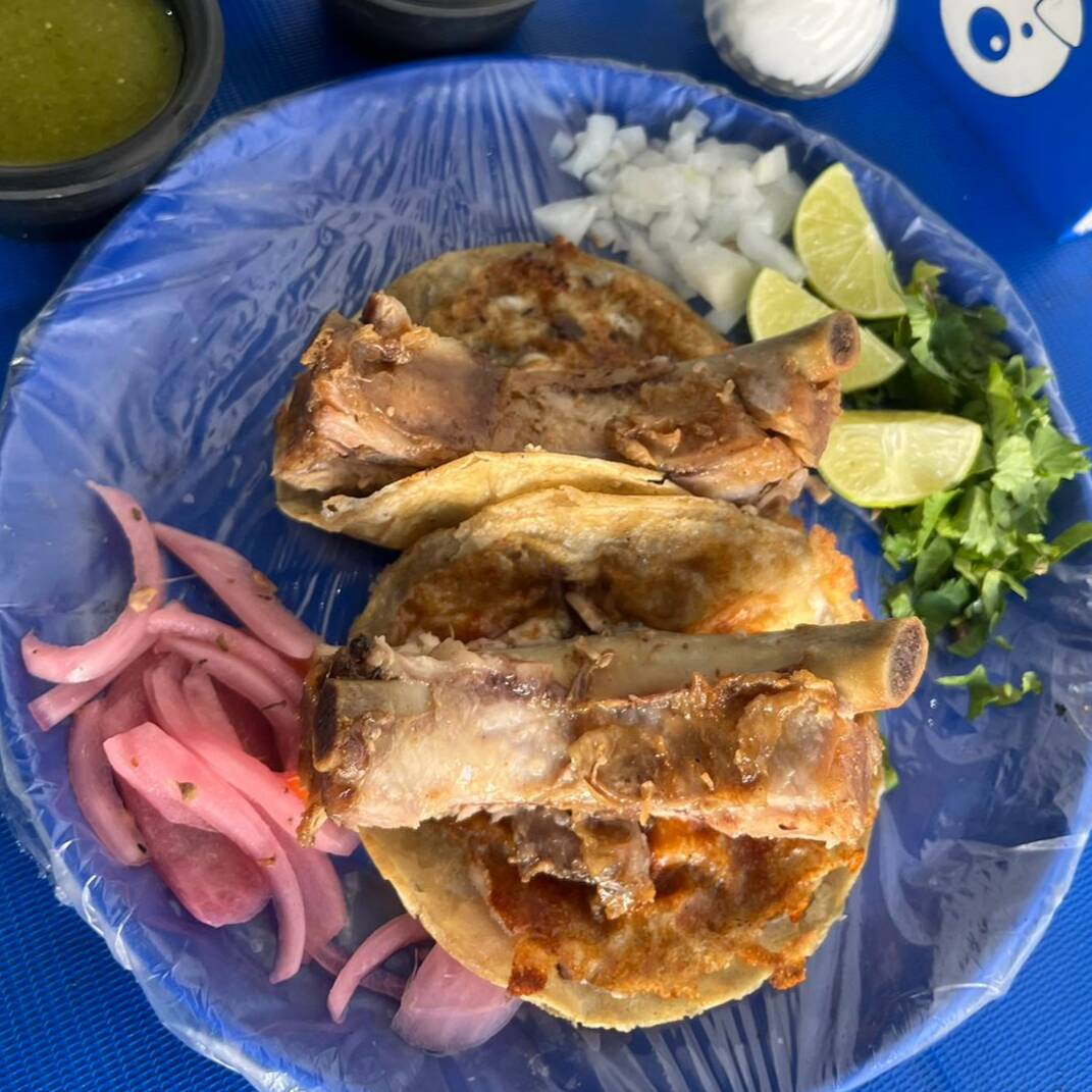 Costra de queso asadero en tortilla de maíz con carnitas, buche y chamorro en tortilla de maíz.