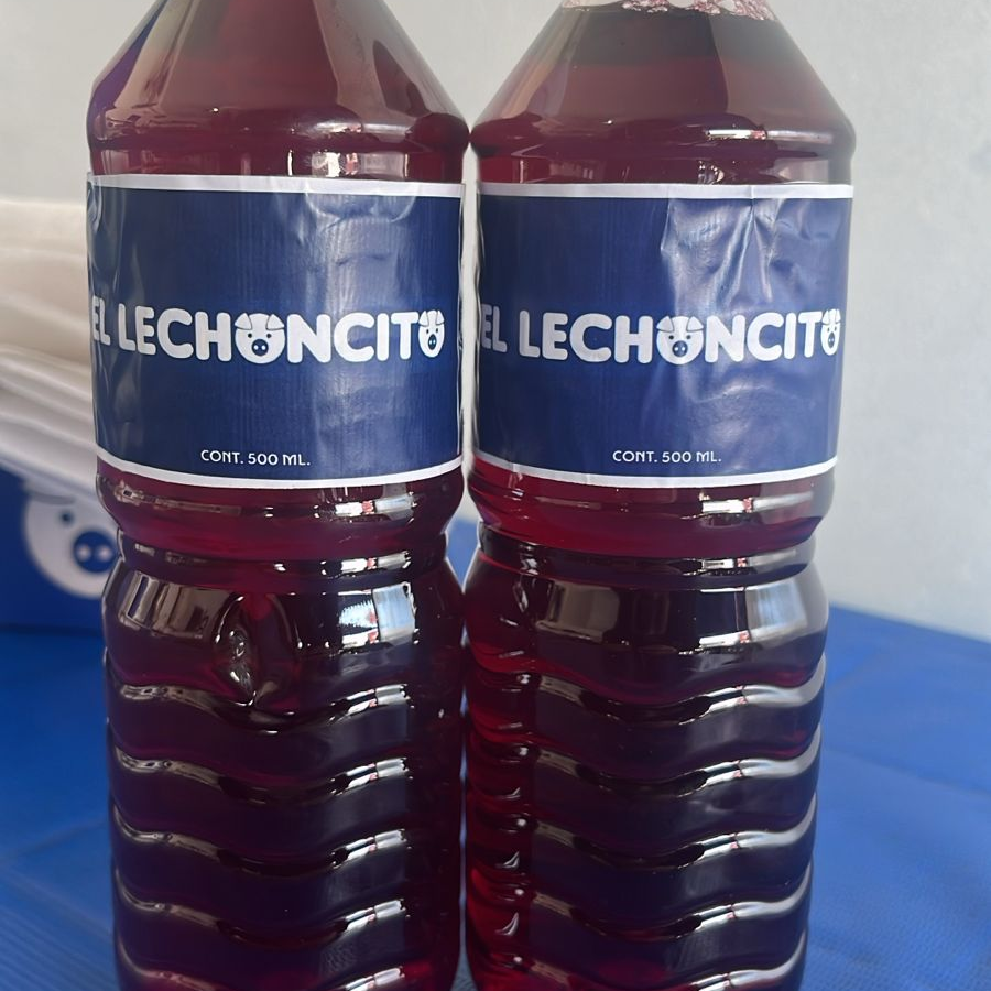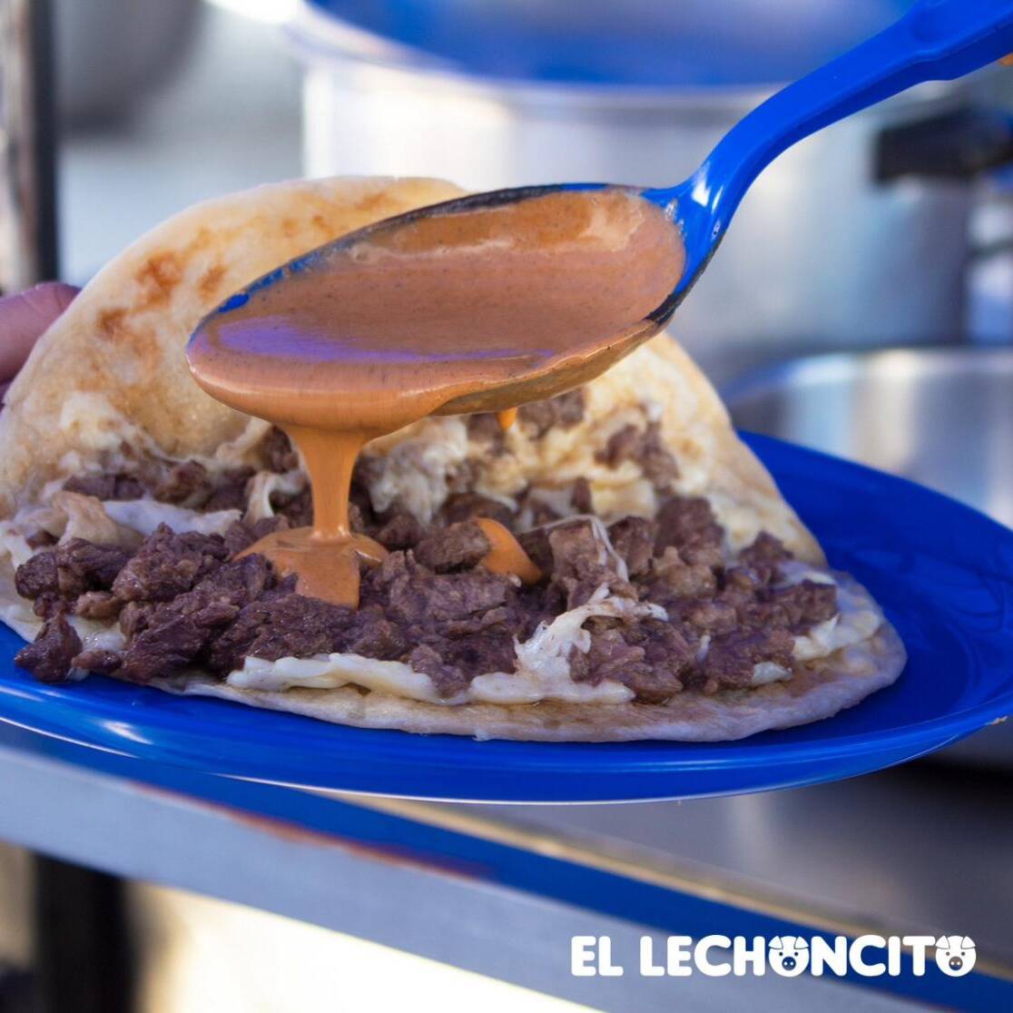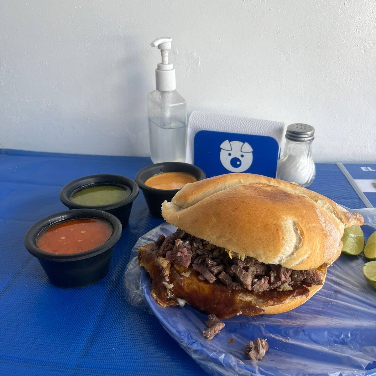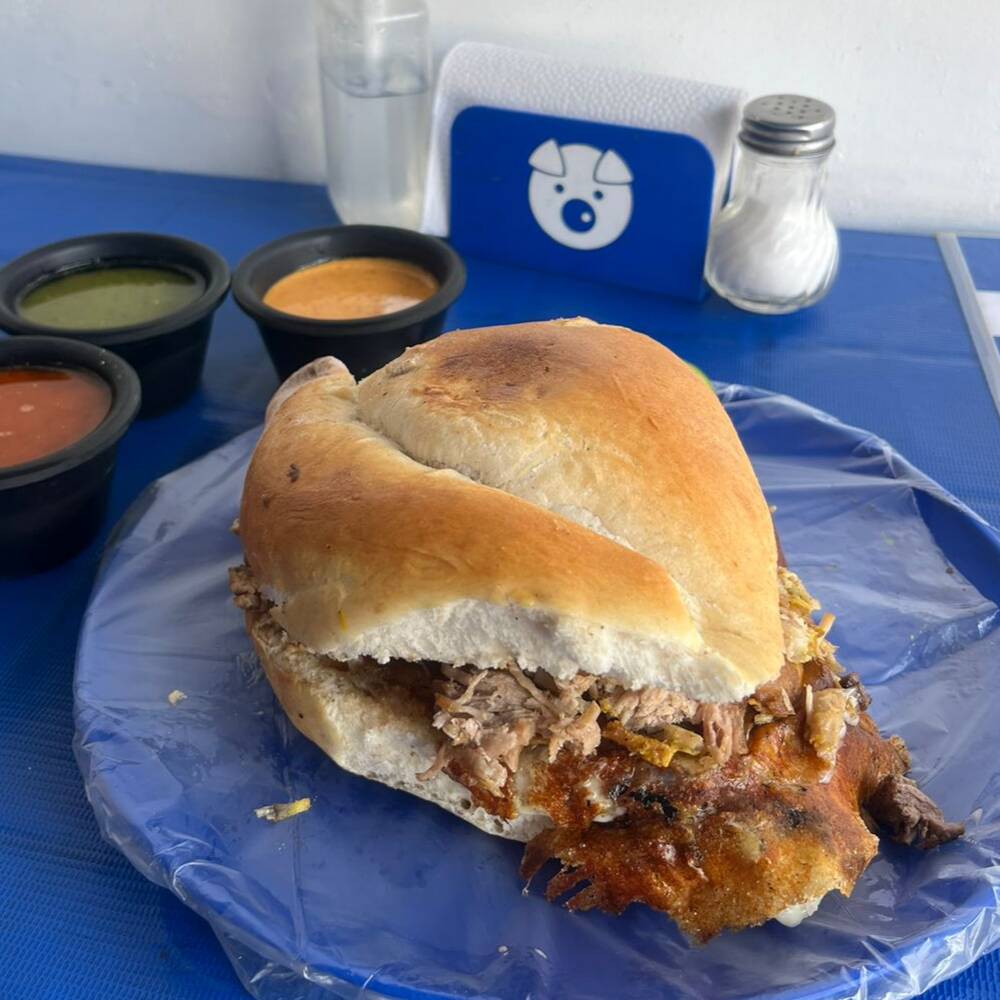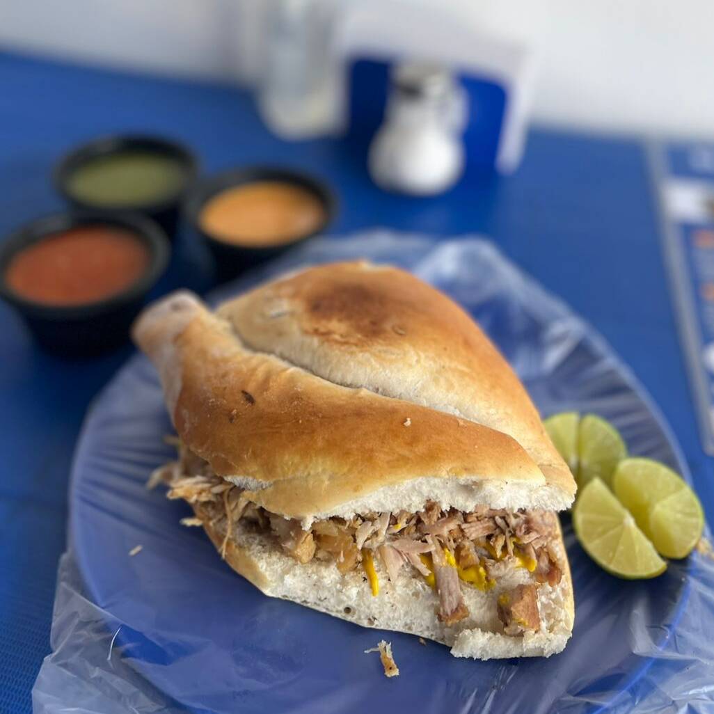 Costra de queso asadero en pan francés y carnitas, buche, chamorro de cerdo.