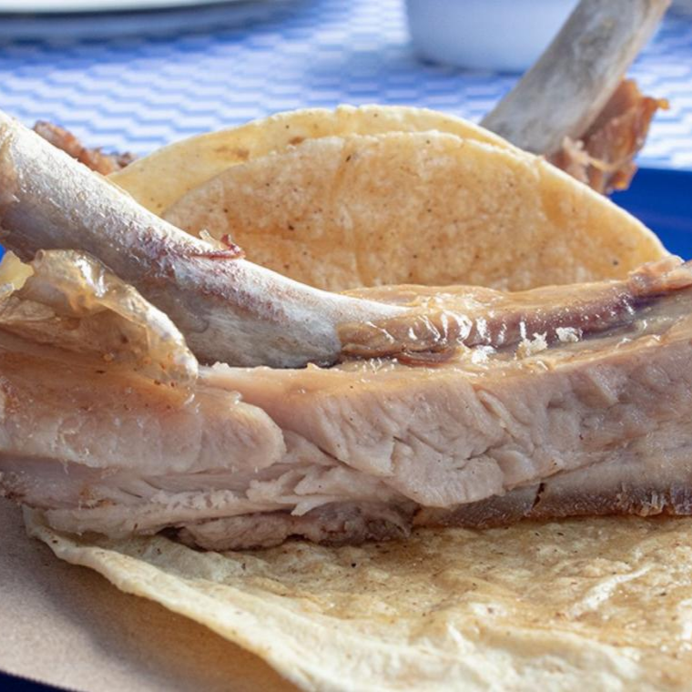 Costra de queso con costilla de cerdo en tortilla de maíz (verduras y salsa aparte).