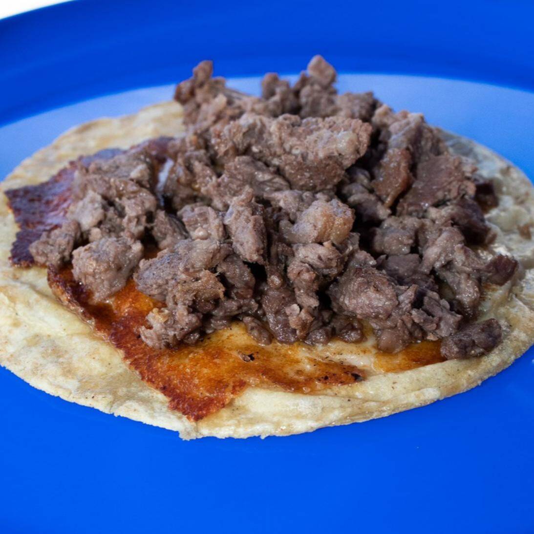 Costras de queso asadero en tortilla de maíz con sirloin de res.