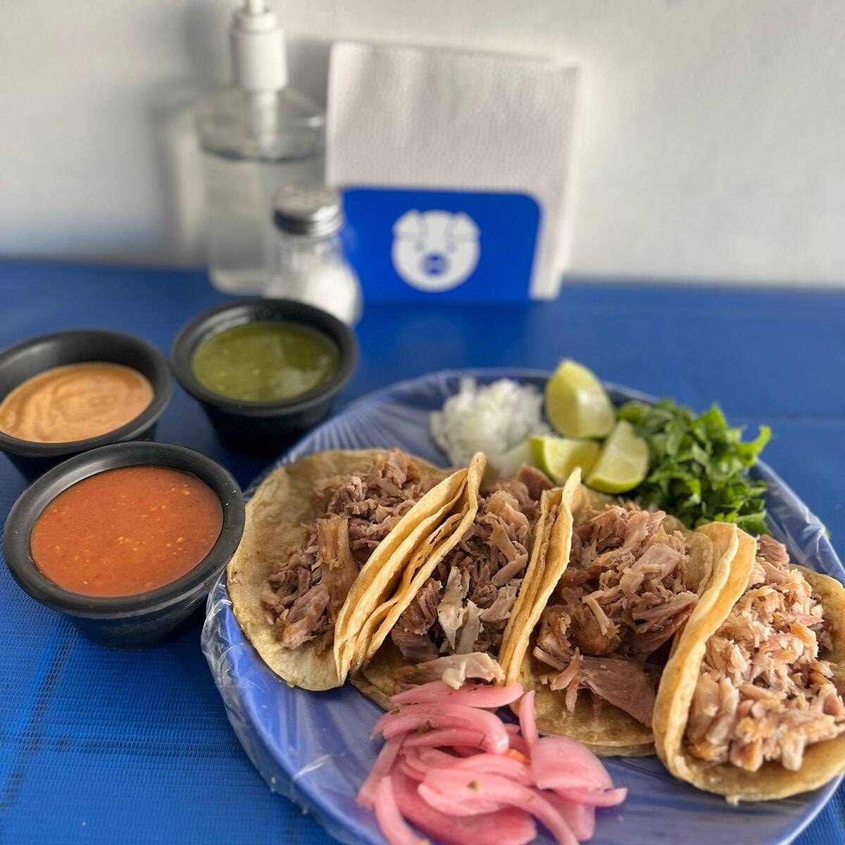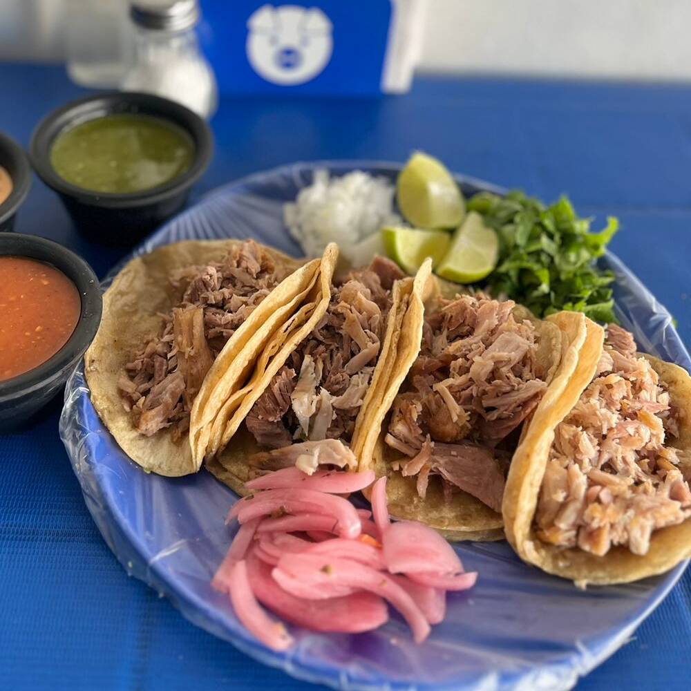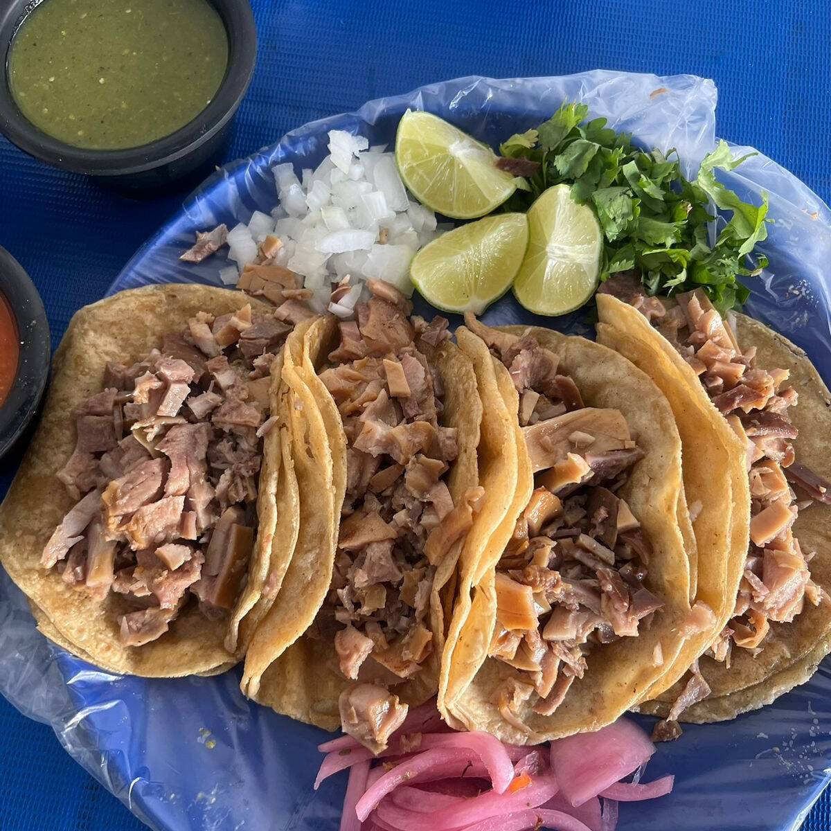 Taco de buche, chamorro y carnitas en tortilla de maíz.