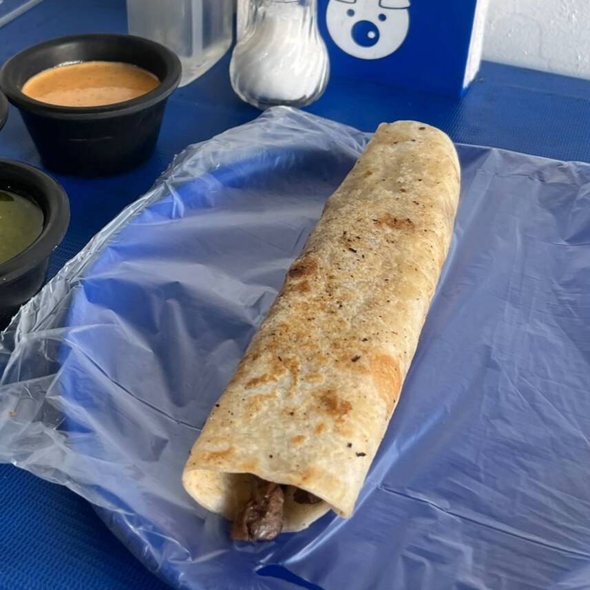 Burrito en tortilla de harina con sirloin de res y queso asadero.
