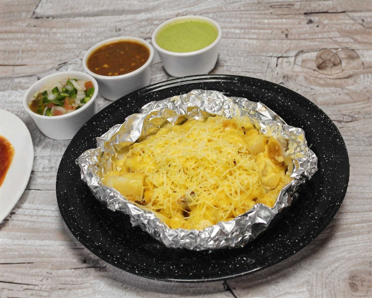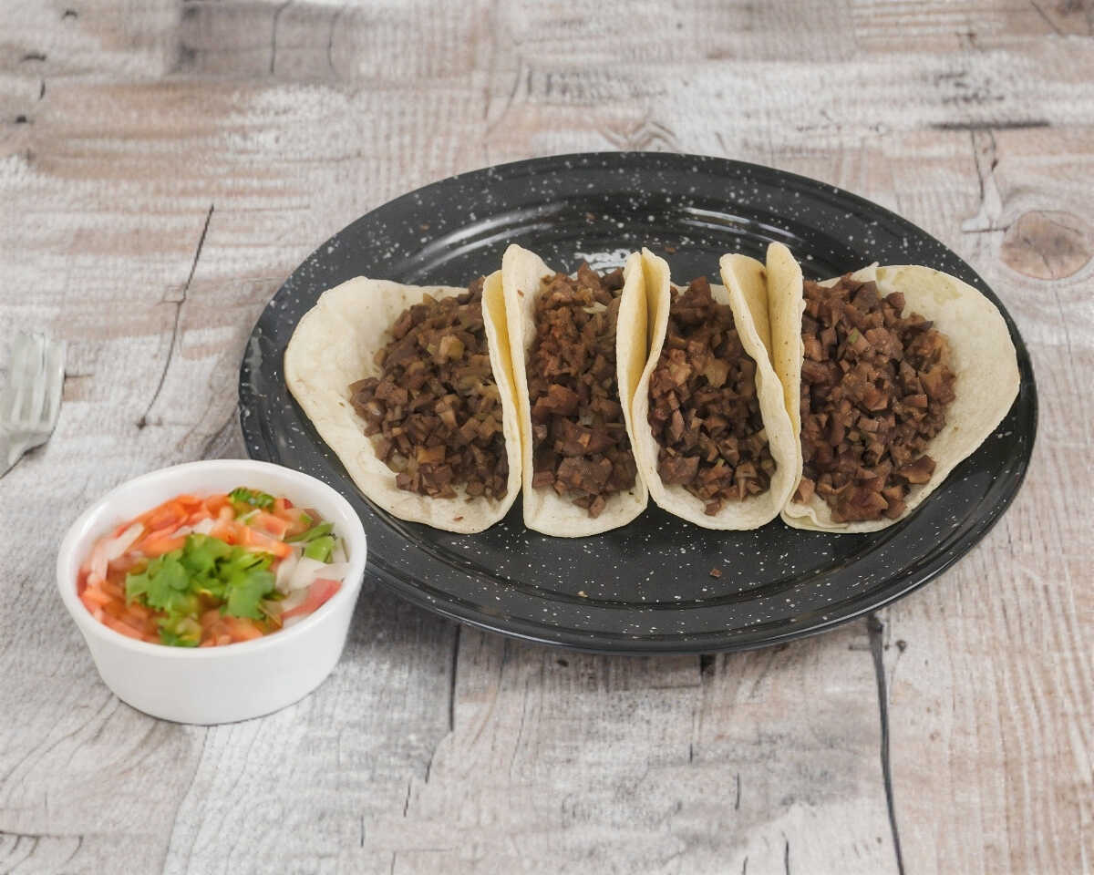 4 tacos de harina o maíz con queso blanco, carne asada y salchicha picada con tocino.