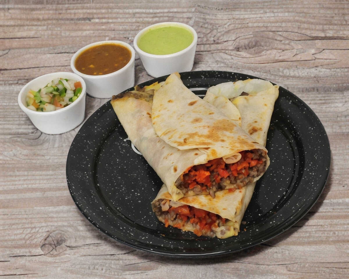 Tortillon de 35 cm. Con frijoles, queso, salchicha picada con tocino y carne asada