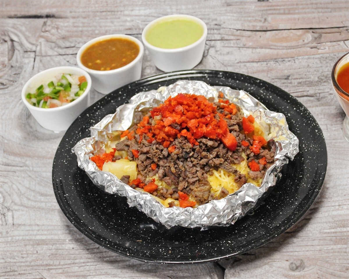 Papá asada con mantequilla, queso amarillo, queso blanco, carne asada y salchicha asada picada con tocino