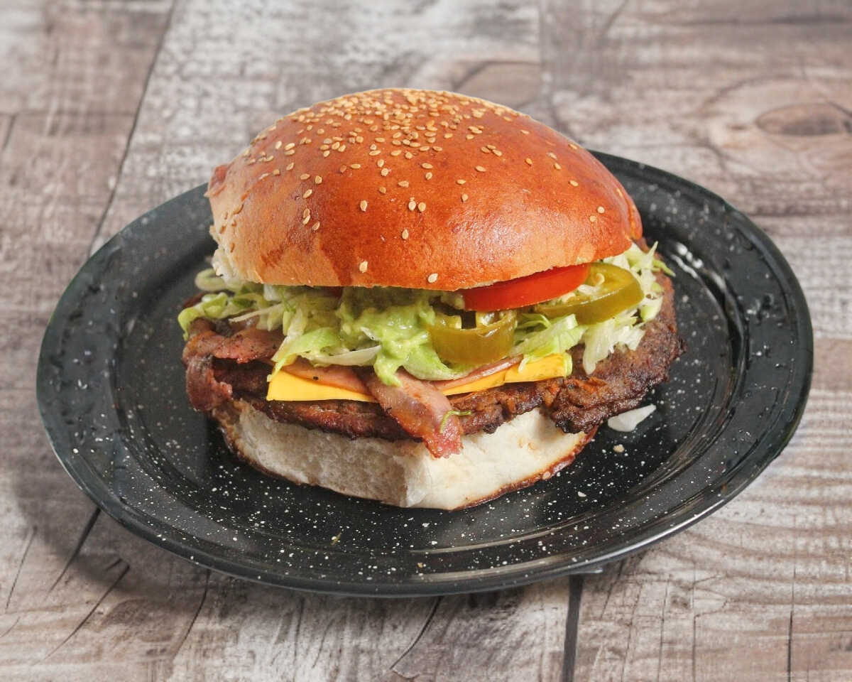 Deliciosa carne de 120 gr. Con jamón, queso, aguacate, tocino, aderezos, mil Islas, lechuga, tomate, cebolla asada y chiles