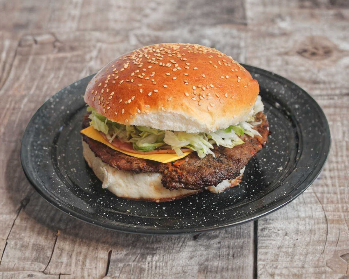 Deliciosa carne de 120 gr. Con jamón, queso, aderezos, mil Islas, lechuga, tomate, cebolla asada y chiles curtidos.