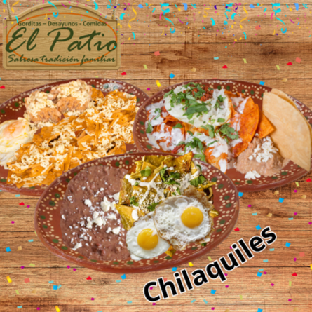 Deliciosos Chilaquiles bañados en la salsa de tu preferencia, acompañados de frijoltios refritos y un guiso.