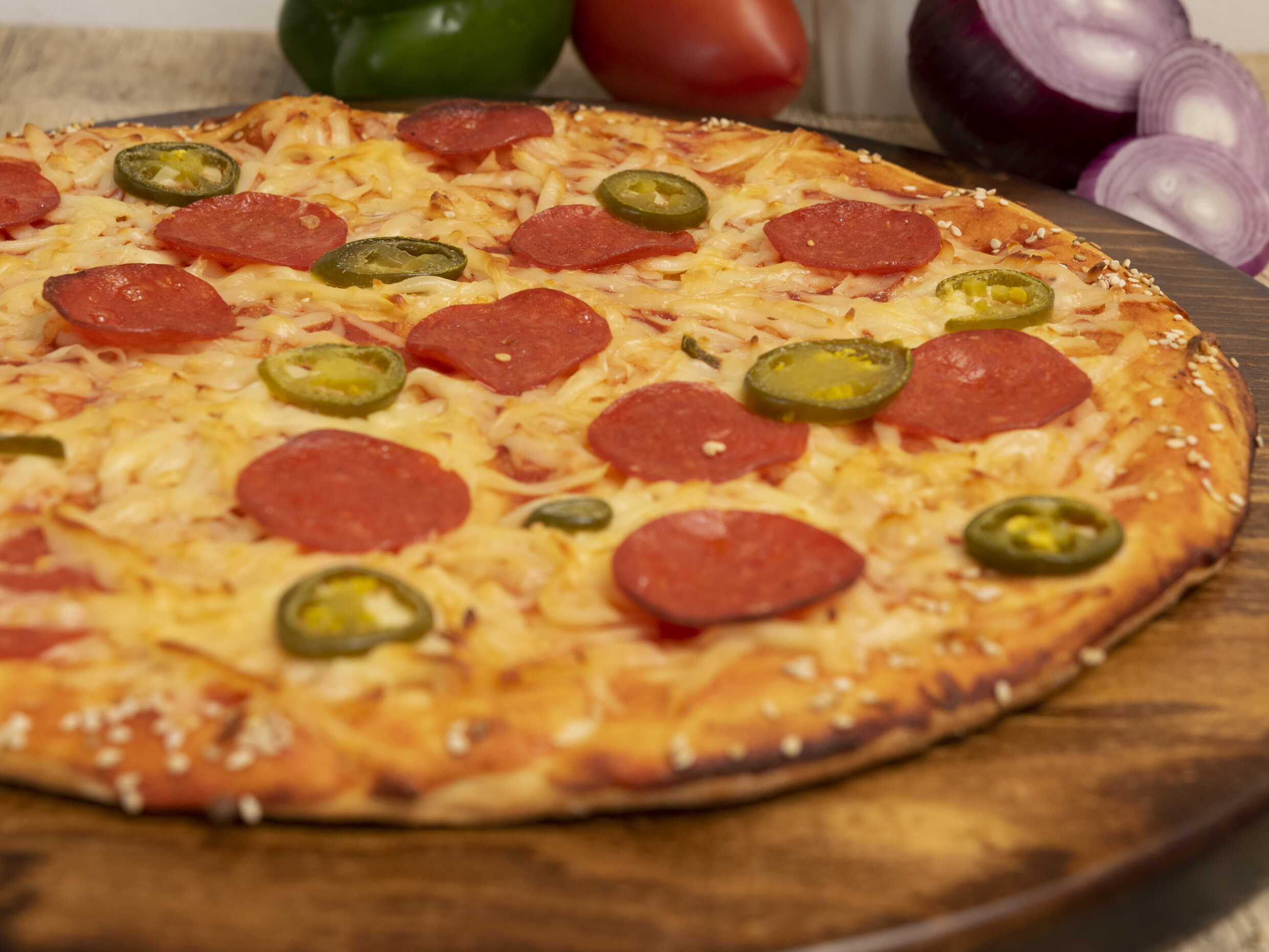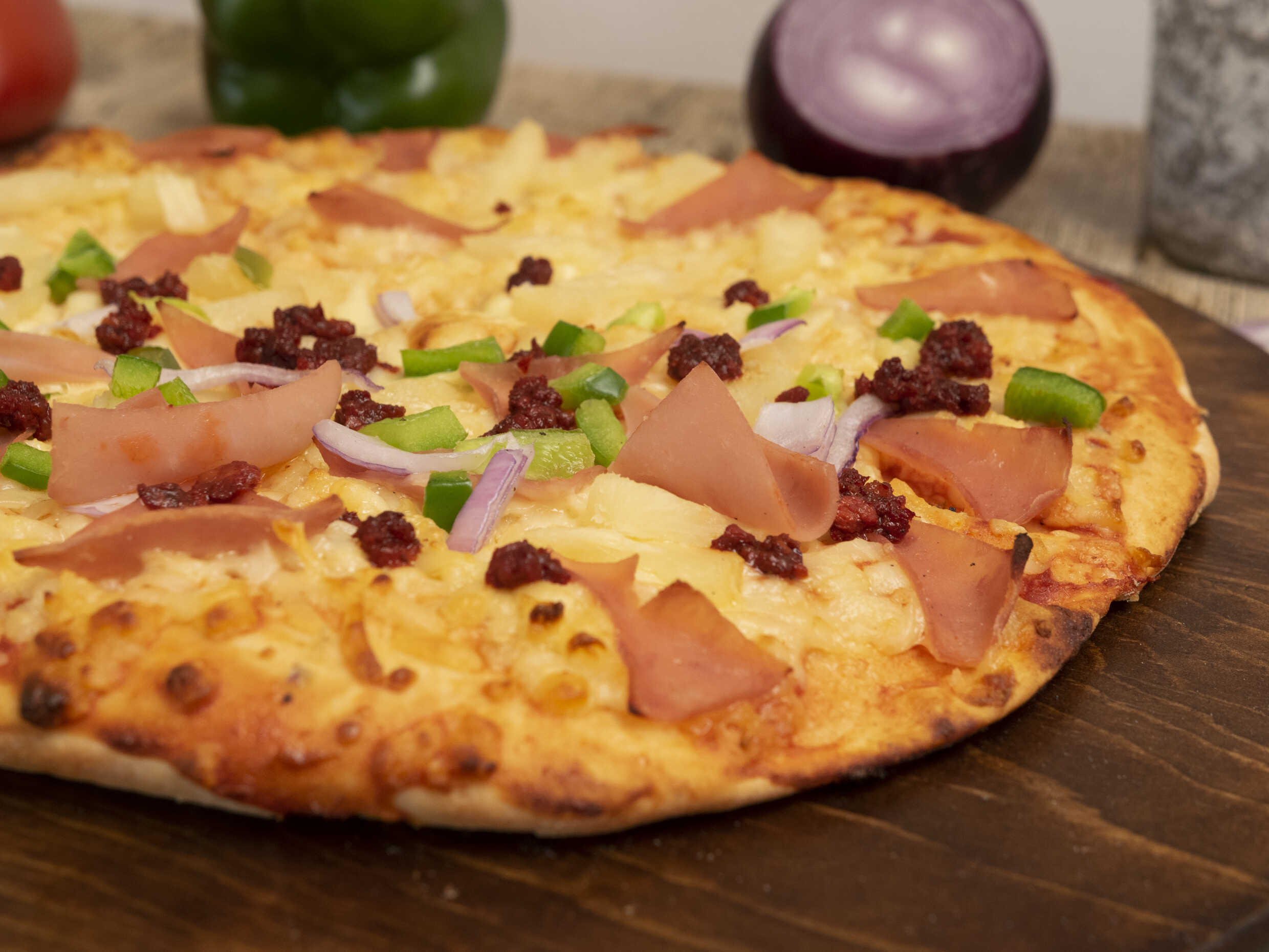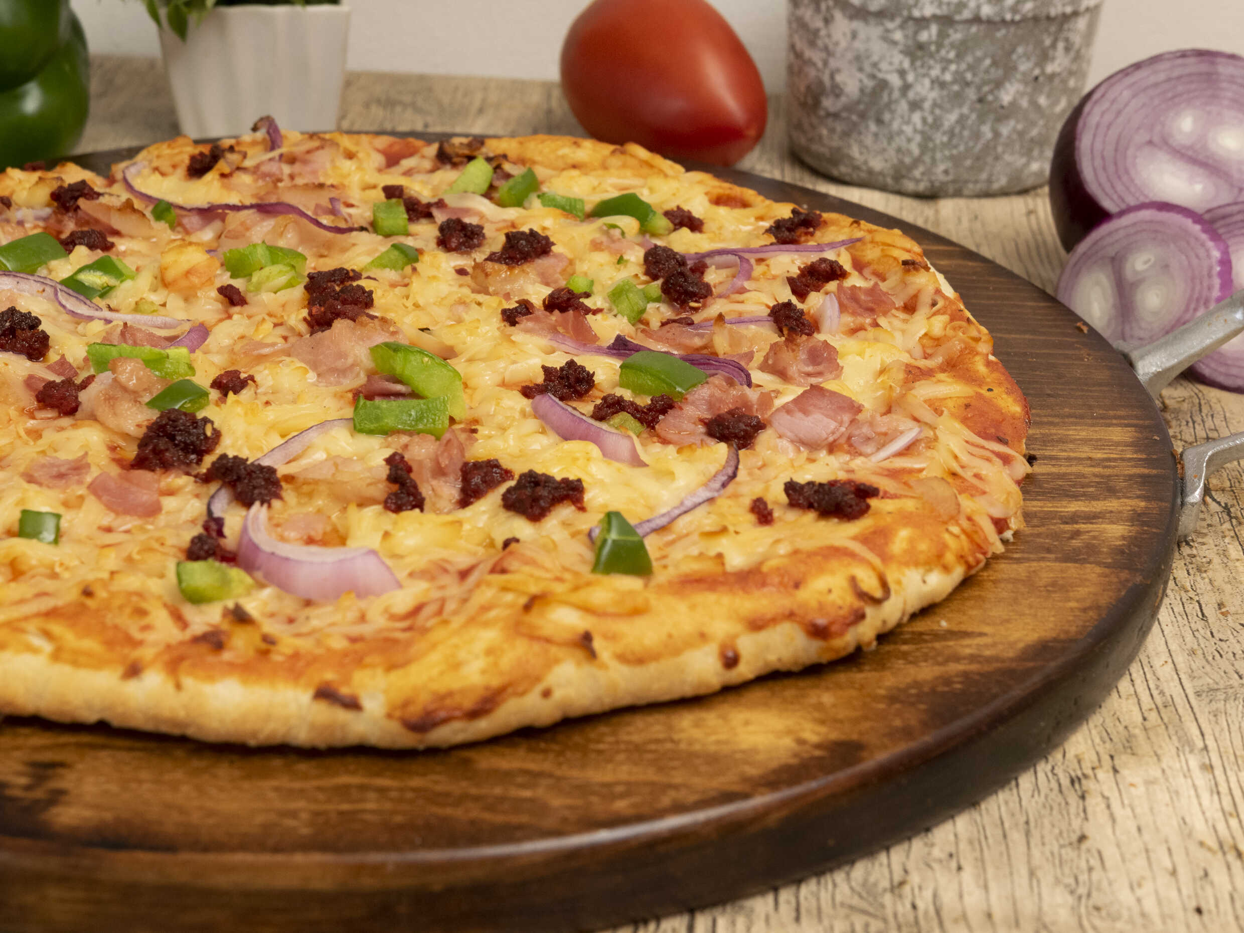 Pizza con tocino, cebolla, chorizo y jalapeño.
