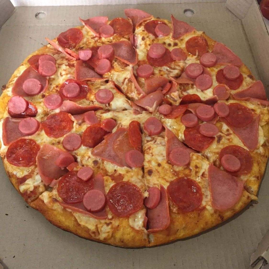 Pizza con tocino, jamón y pepperoni.